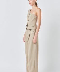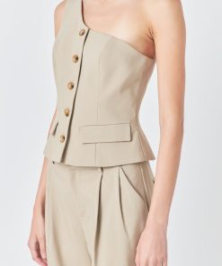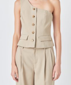 Introducing our stylish Asymmetrical One Shoulder Vest – the perfect addition to your wardrobe! Featuring a trendy one shoulder design and front buttons this top exudes a chic and modern vibe. The asymmetrical hemline adds a touch of edginess to the classic silhouette. But that’s not all – with non-functional front pockets you’ll have the perfect balance of fashion and functionality. This versatile piece is perfect for any occasion and is sure to elevate any outfit. Shop now and be the center of attention!
