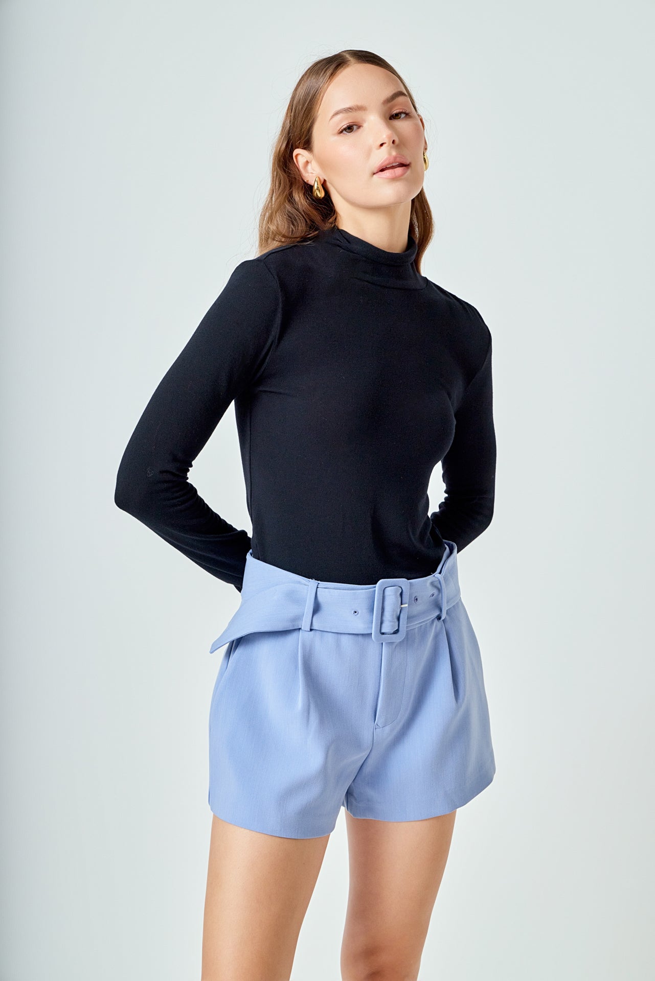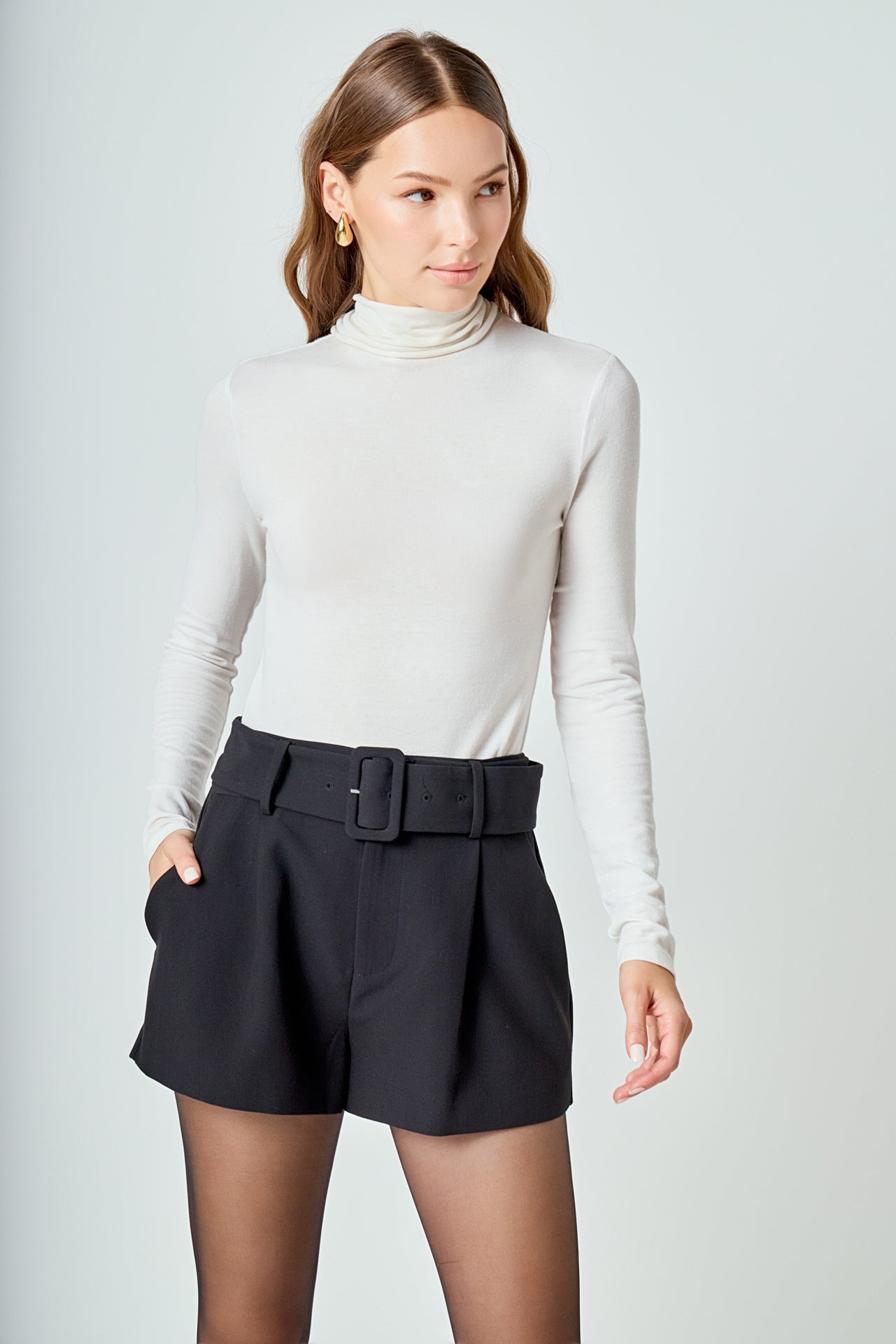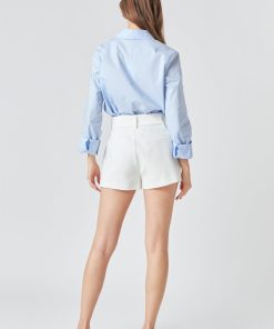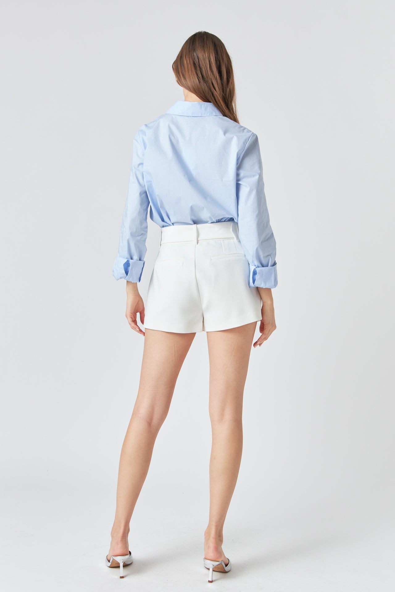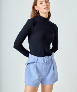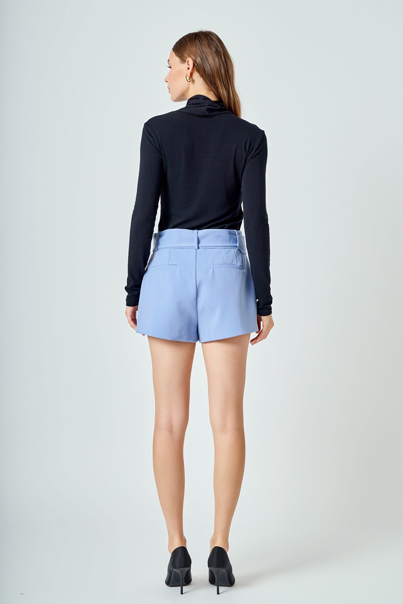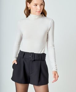 Our Belted Mini Shorts offer a stylish and modern look. The mini length and front side pocket create a flattering silhouette. The included PU combine belt and pintuck detail add an extra touch of sophistication. These shorts are perfect for completing any outfit.