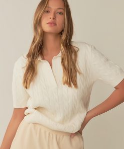 This cable knit sweater is not only soft and comfortable but also stylish. The collar and short sleeves add a modern twist and make this sweater easy to pair with all of your favorite bottoms. Whether it’s faux leather pants or a high-waisted skirt this sweater will add the perfect cozy element.
