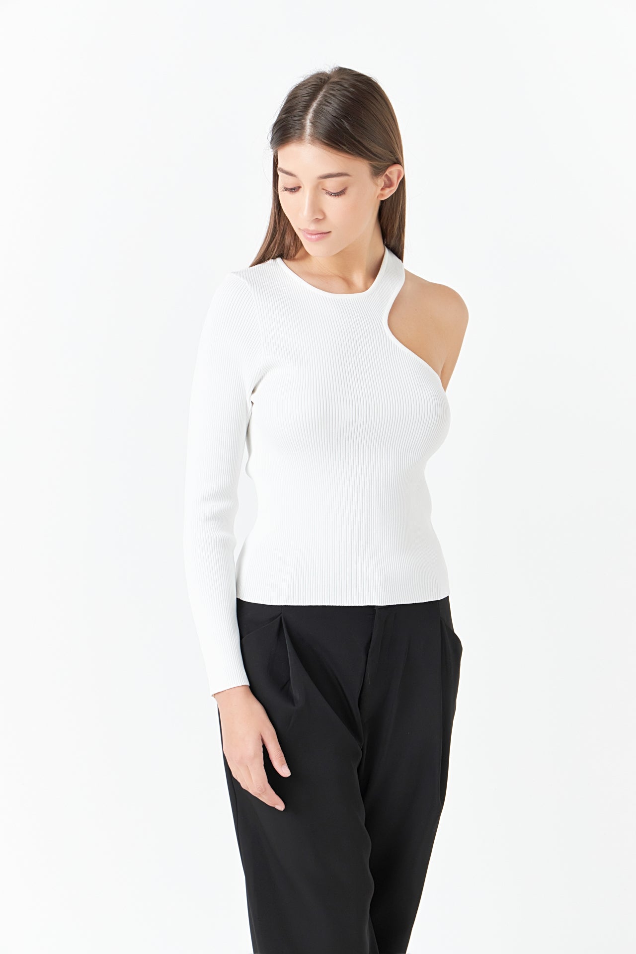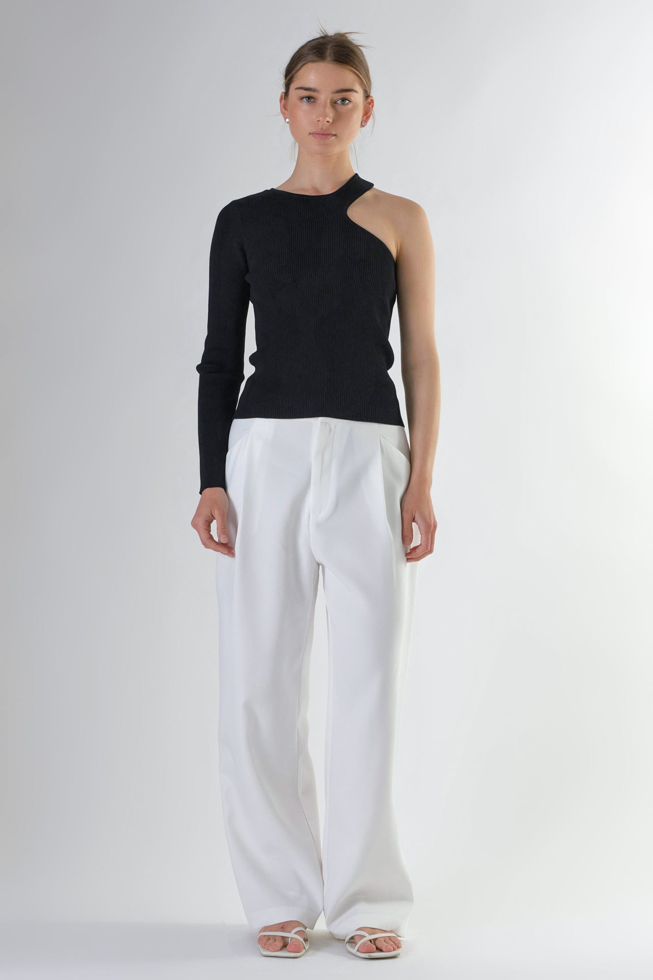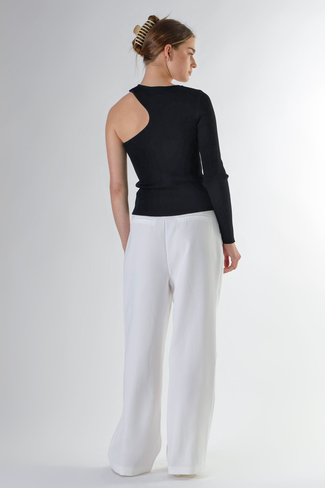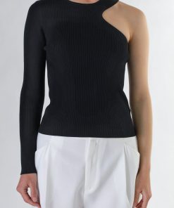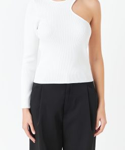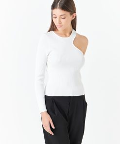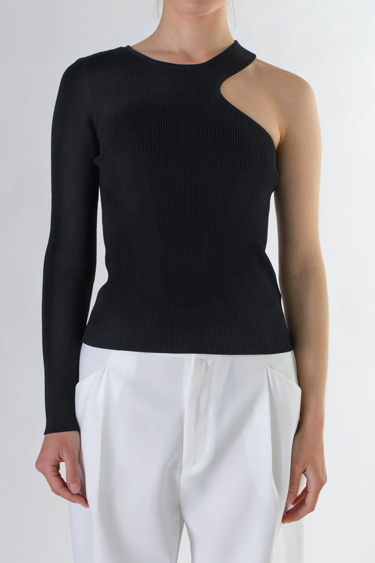 Every girl needs a knit top with cut-outs in her wardrobe. With its one shoulder silhouette and fitted style, this knitted top is perfect for showing off your curves. The round neckline is flattering and timeless. Whether you wear it to work or out on the town, this top is sure to turn heads.