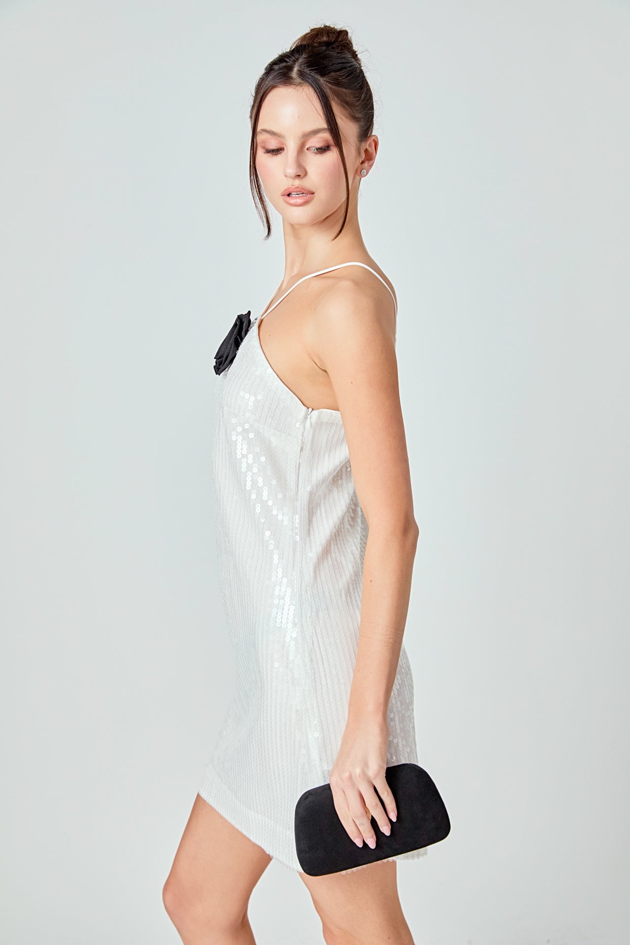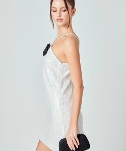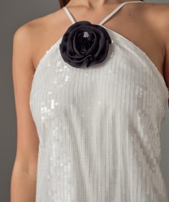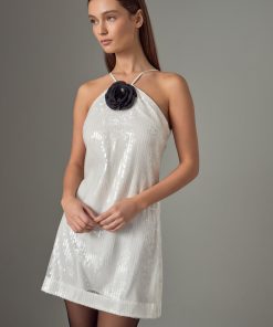 Looking for the perfect birthday dinner outfit? Look no further! Our dazzling Aimee Sequin Halter Mini Dress with Florette is the perfect blend of elegance and playful charm. It features a shimmery sequin fabric that sparkles with every step and a delicate florette that adds a feminine and flirty touch. The flattering mini length is perfect if you want to highlight your legs or pair it with black stockings and chic kitten heels. A must-have for any wardrobe, this dress is crafted to make you feel confident and glamorous. Shop now and prepare to look captivating!