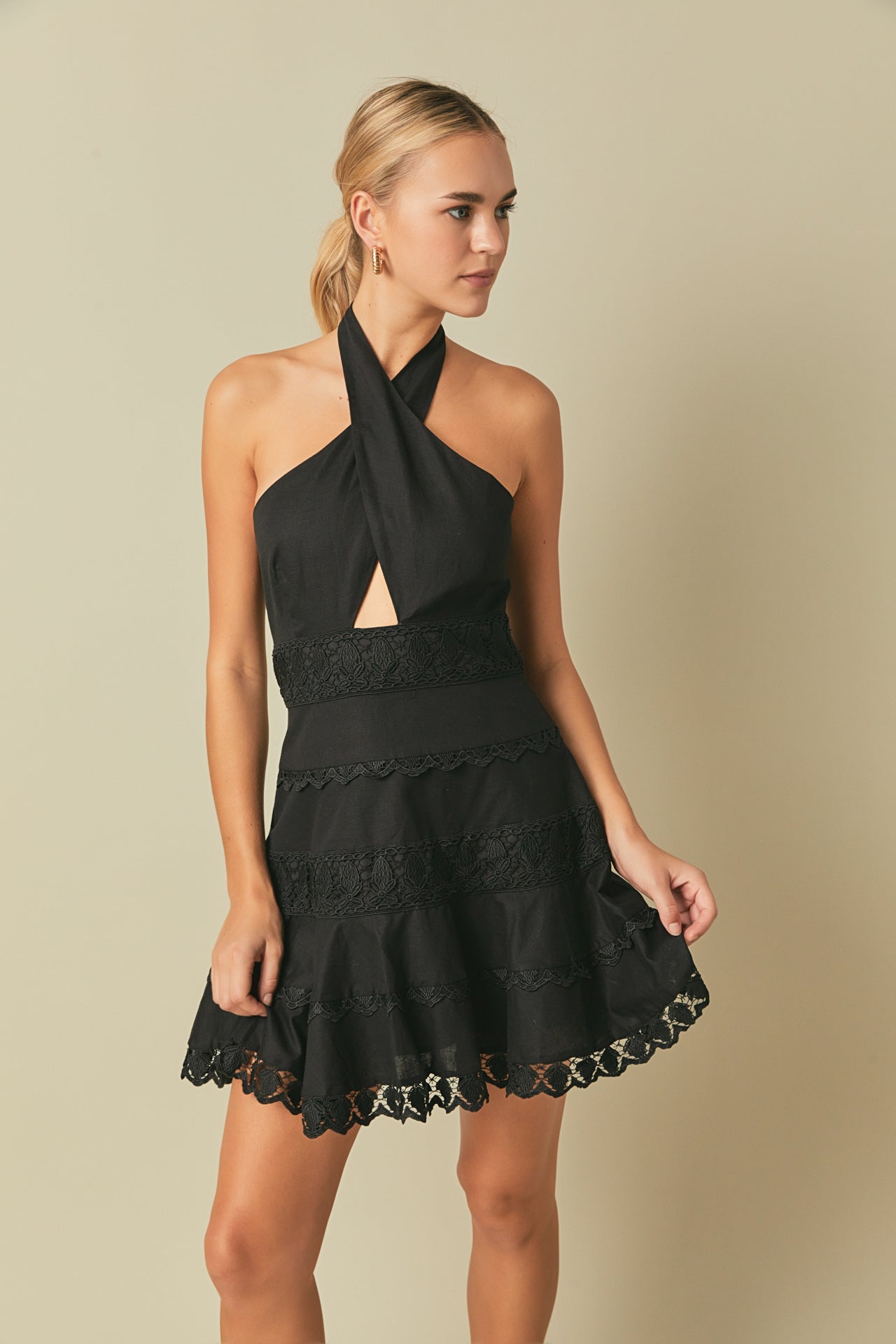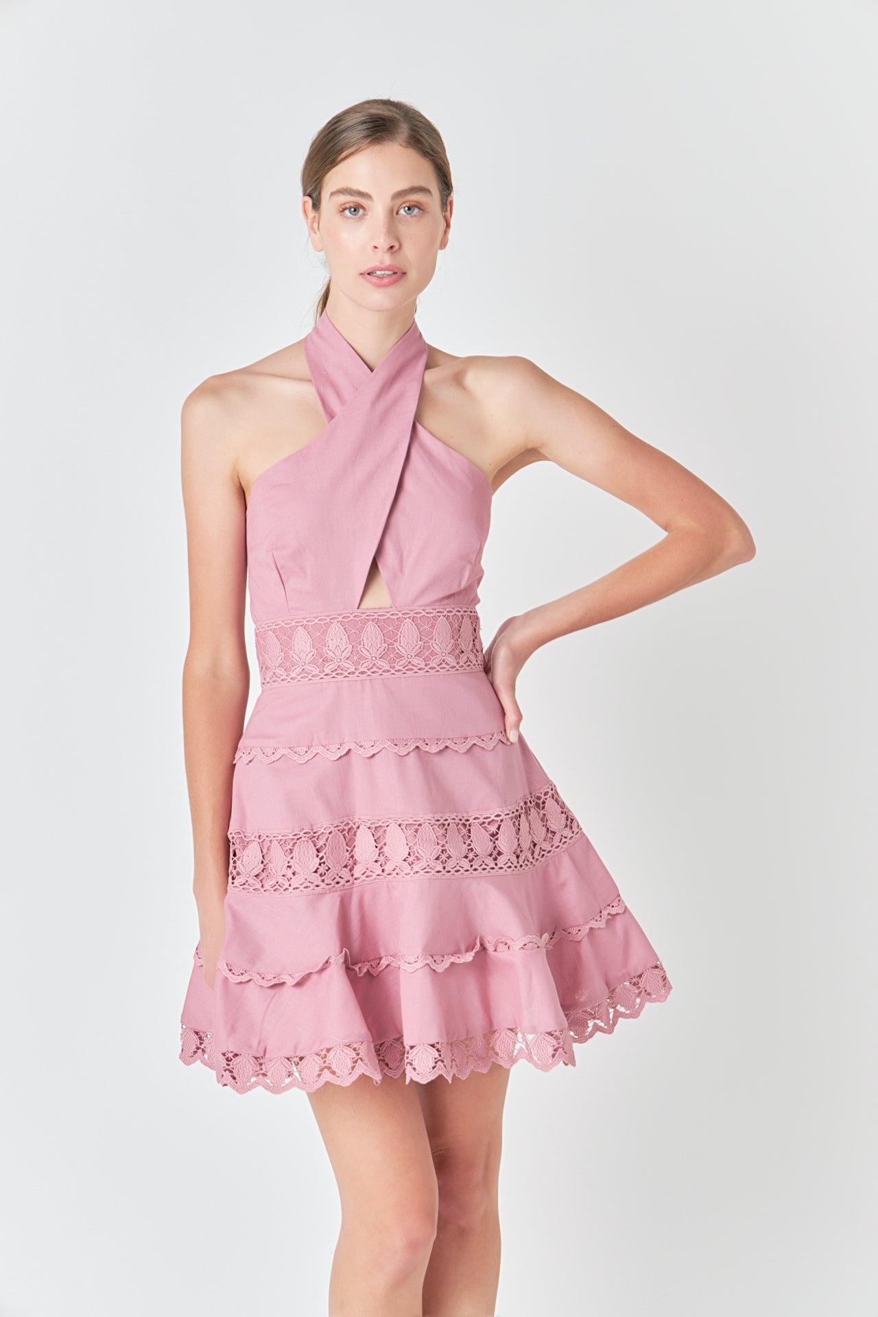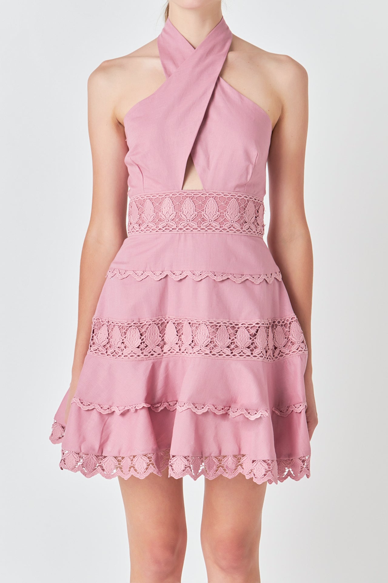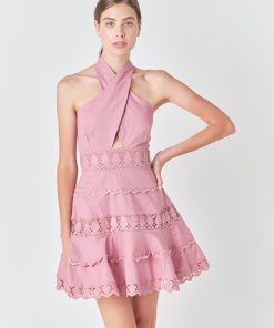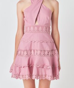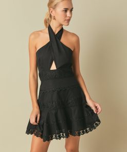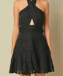 This halter neck lace trim dress is perfect! The crossed halter neck flatters your shoulders and neck, while the lace trimmed skirt adds a touch of elegance. The center back invisible zipper closure ensures a perfect fit, and the smocking detail at the back bodice adds a bit of flair.
