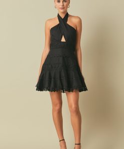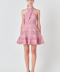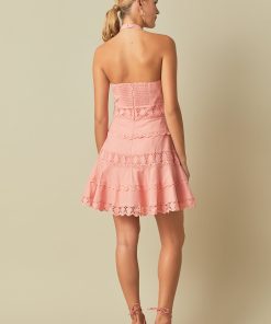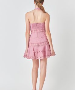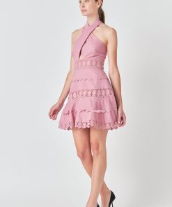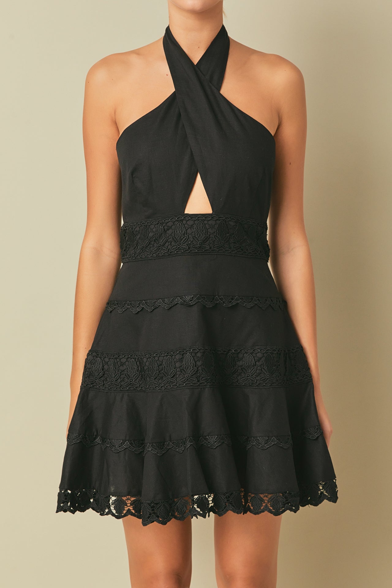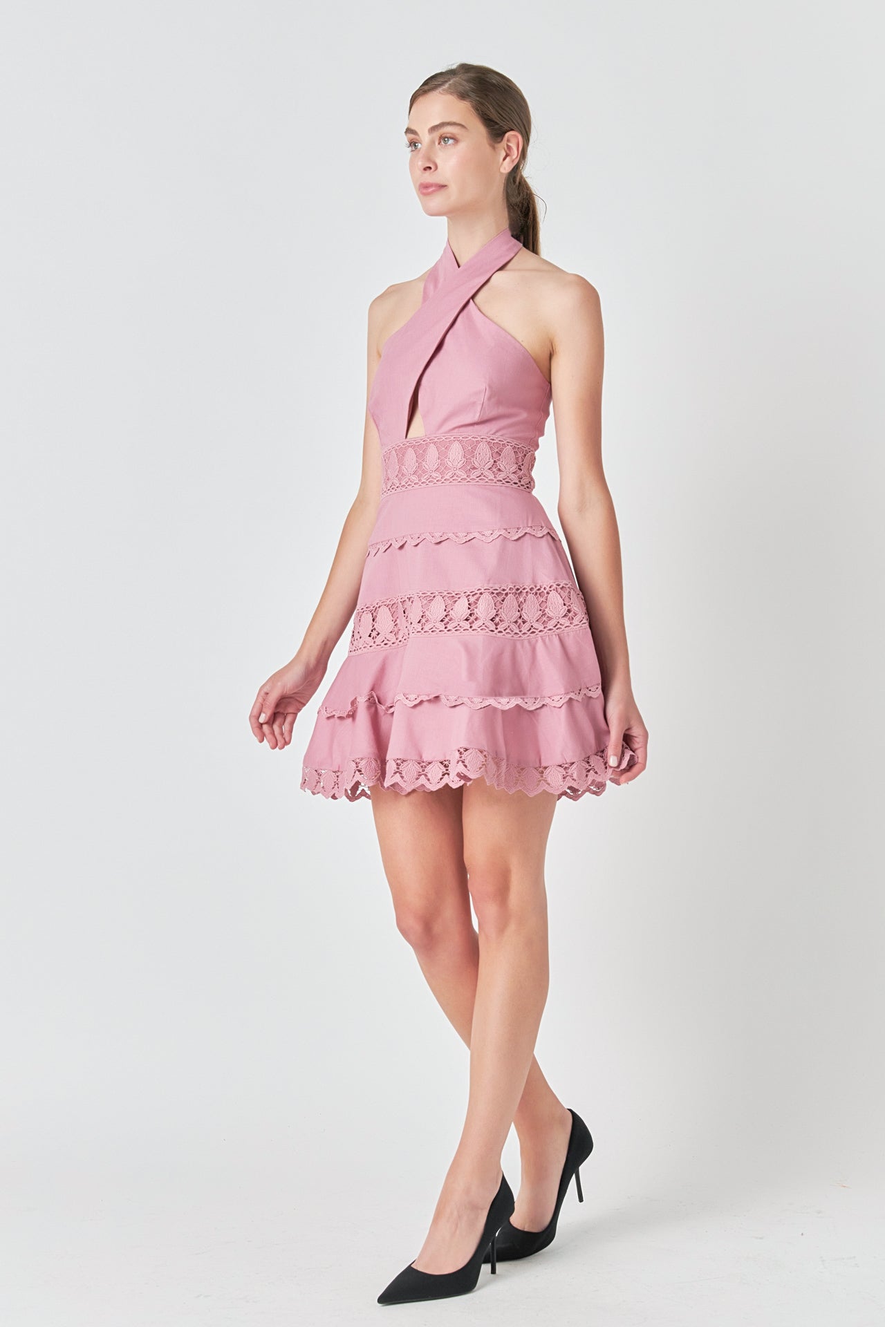 This halter neck lace trim dress is perfect! The crossed halter neck flatters your shoulders and neck, while the lace trimmed skirt adds a touch of elegance. The center back invisible zipper closure ensures a perfect fit, and the smocking detail at the back bodice adds a bit of flair.