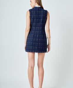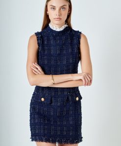 Effortlessly elegant and chic, our Lace Detail Tweed Mini Dress is sure to turn heads. The mini length shows off your legs, while the removable lace adds a touch of flirty femininity. Made from high-quality tweed, it’s soft, comfortable, and perfect for any occasion. The mock neck band adds a sophisticated touch and elevates the overall look. With its versatile design and superior craftsmanship, this dress will become your go-to for any event. Stand out from the crowd in style and shop our Lace Detail Tweed Mini Dress now.