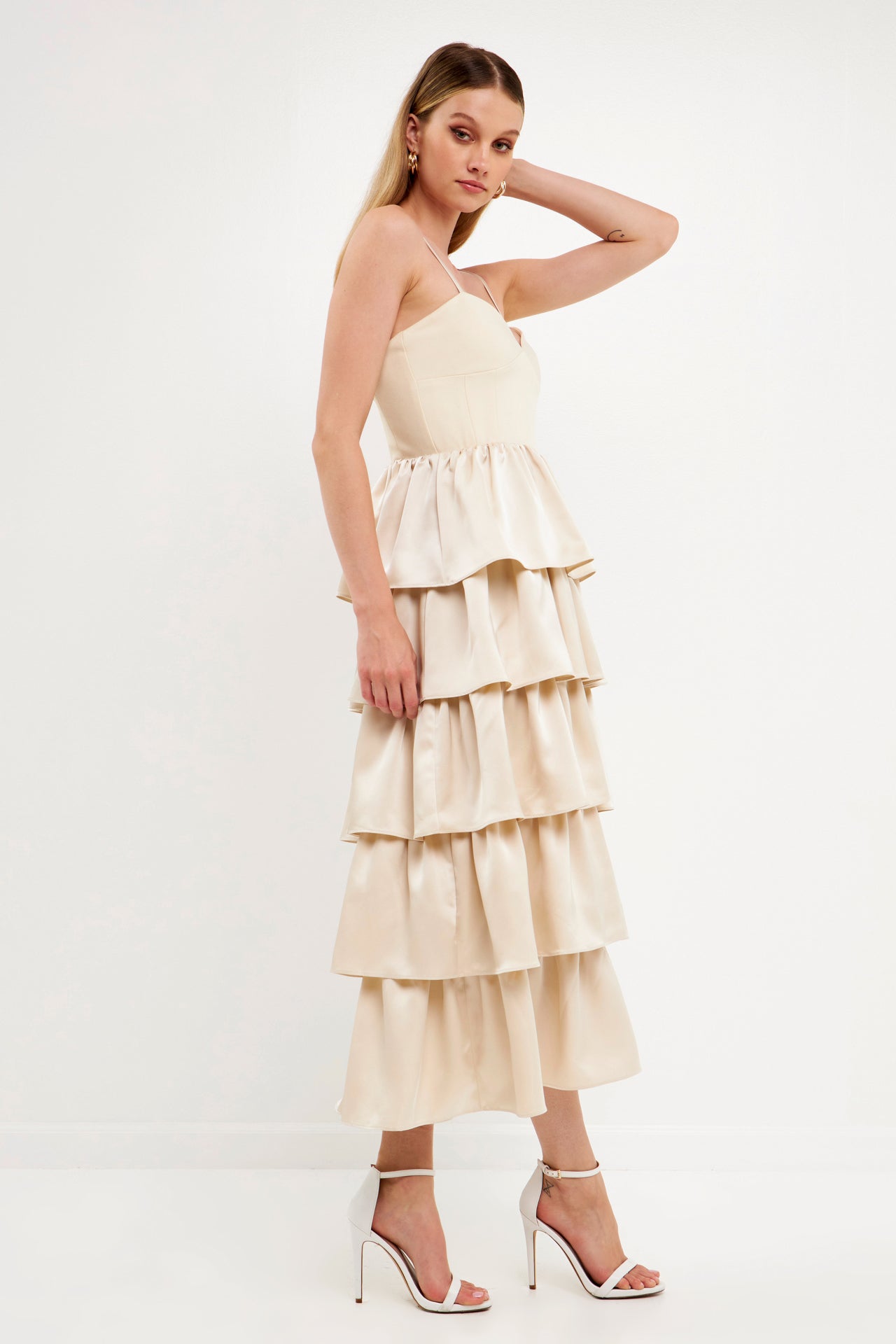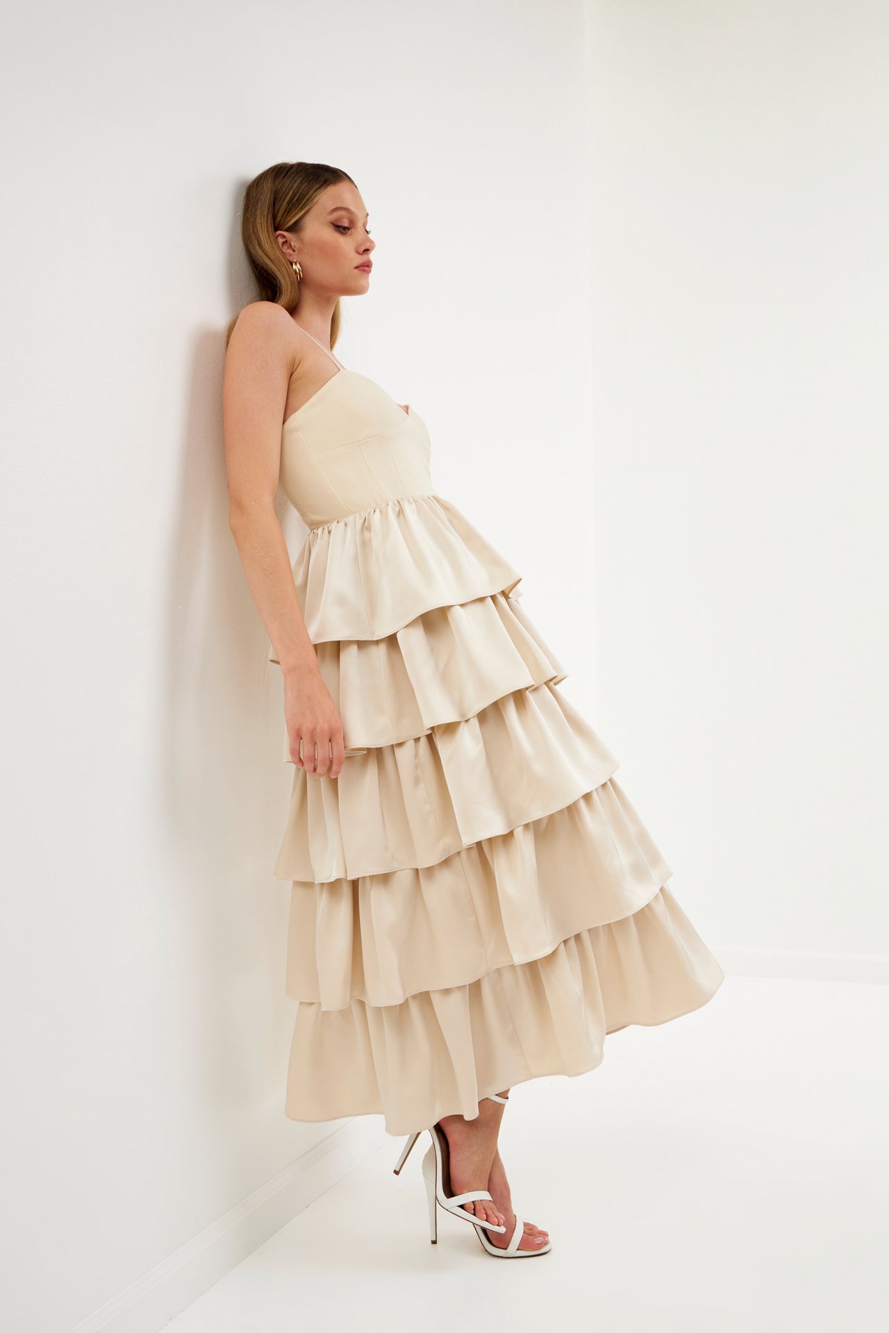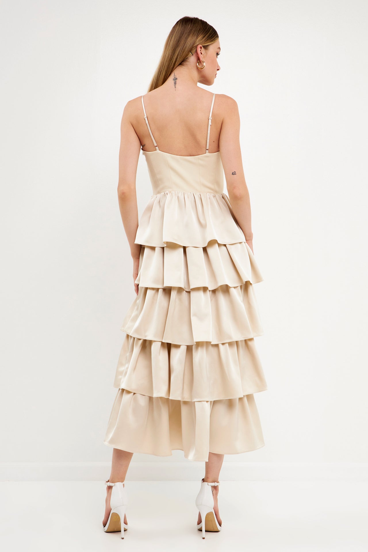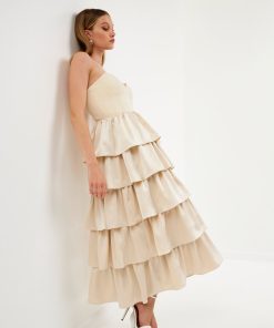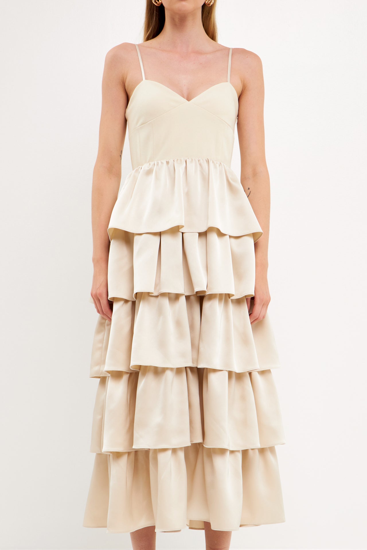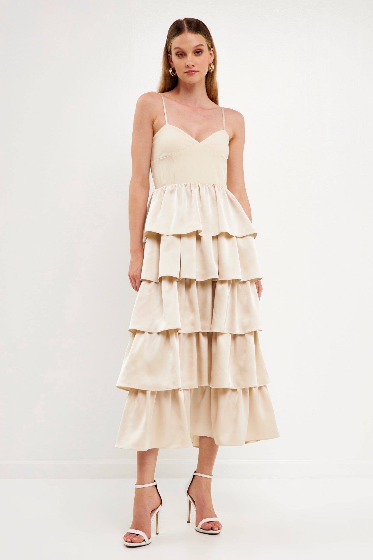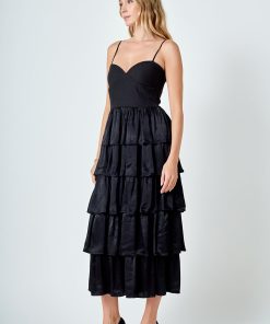 - Tiered skirt made of satin-like material