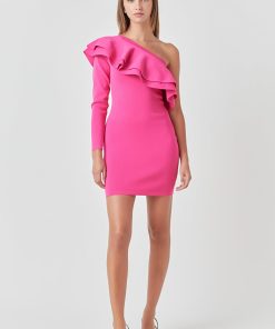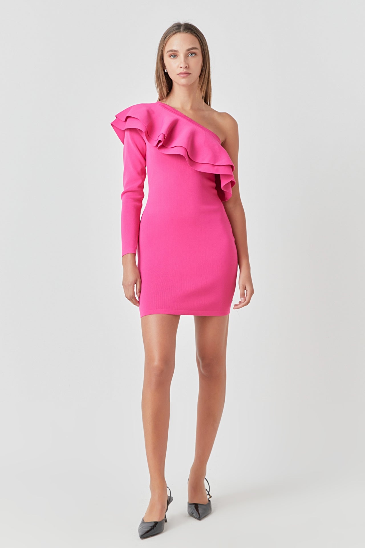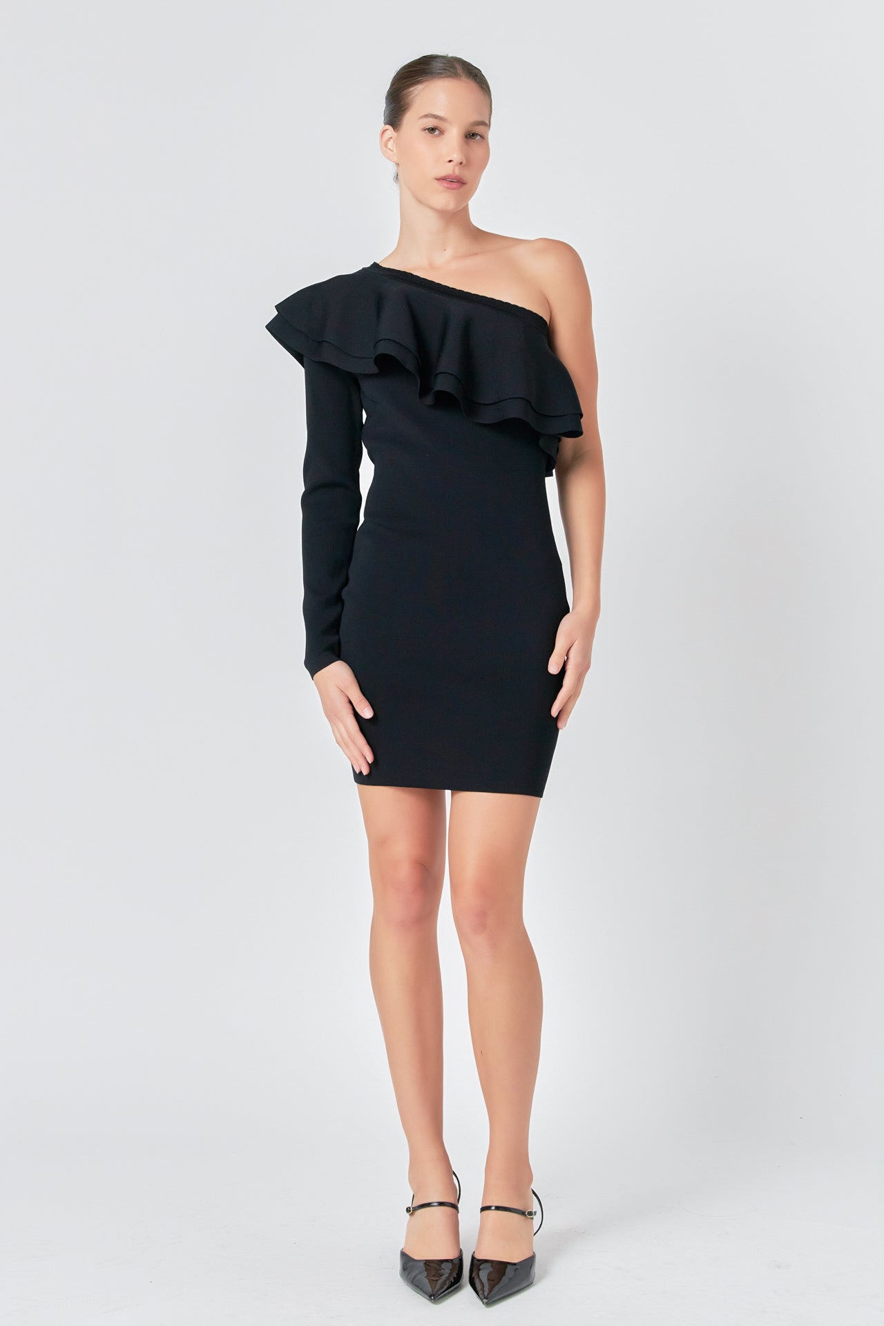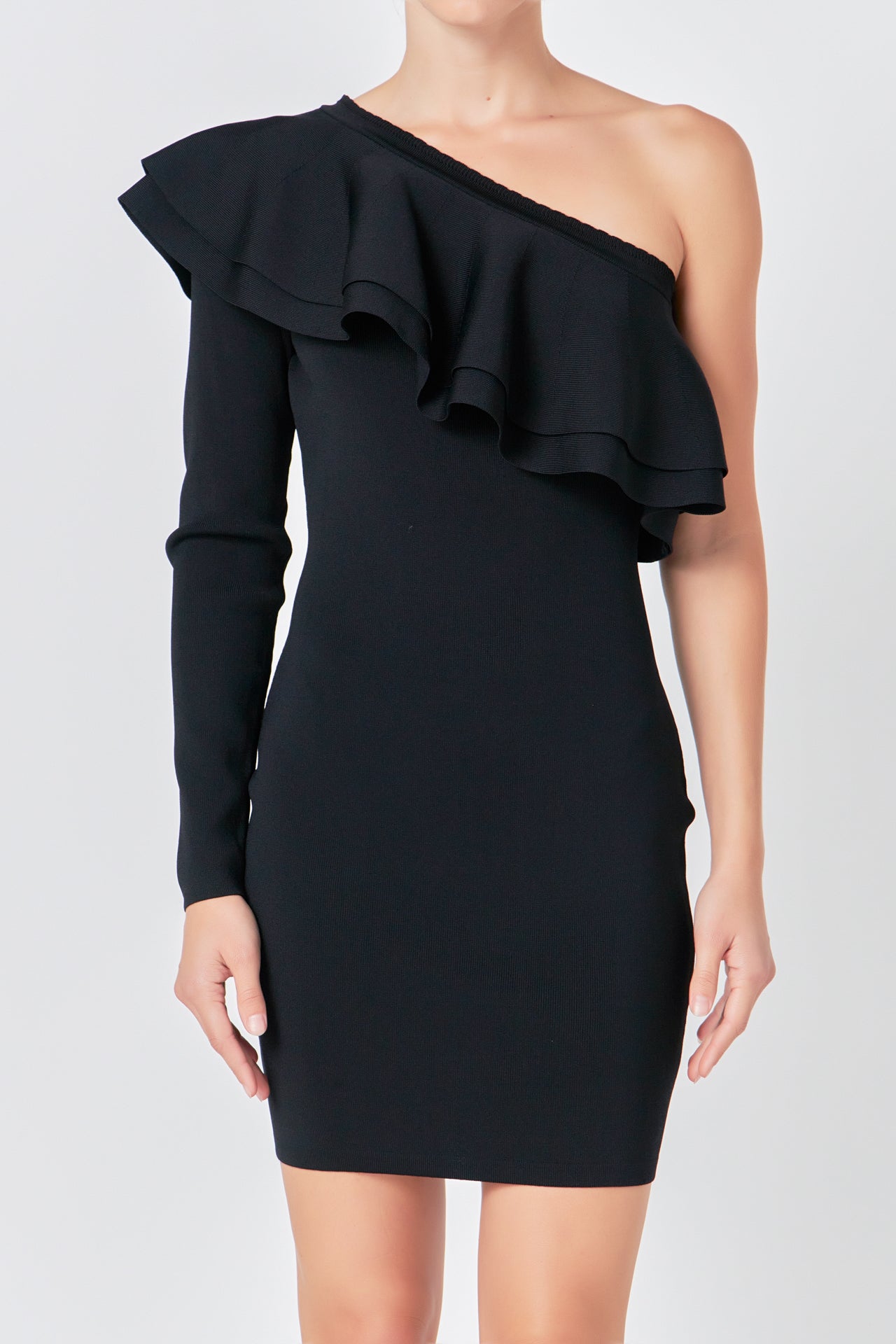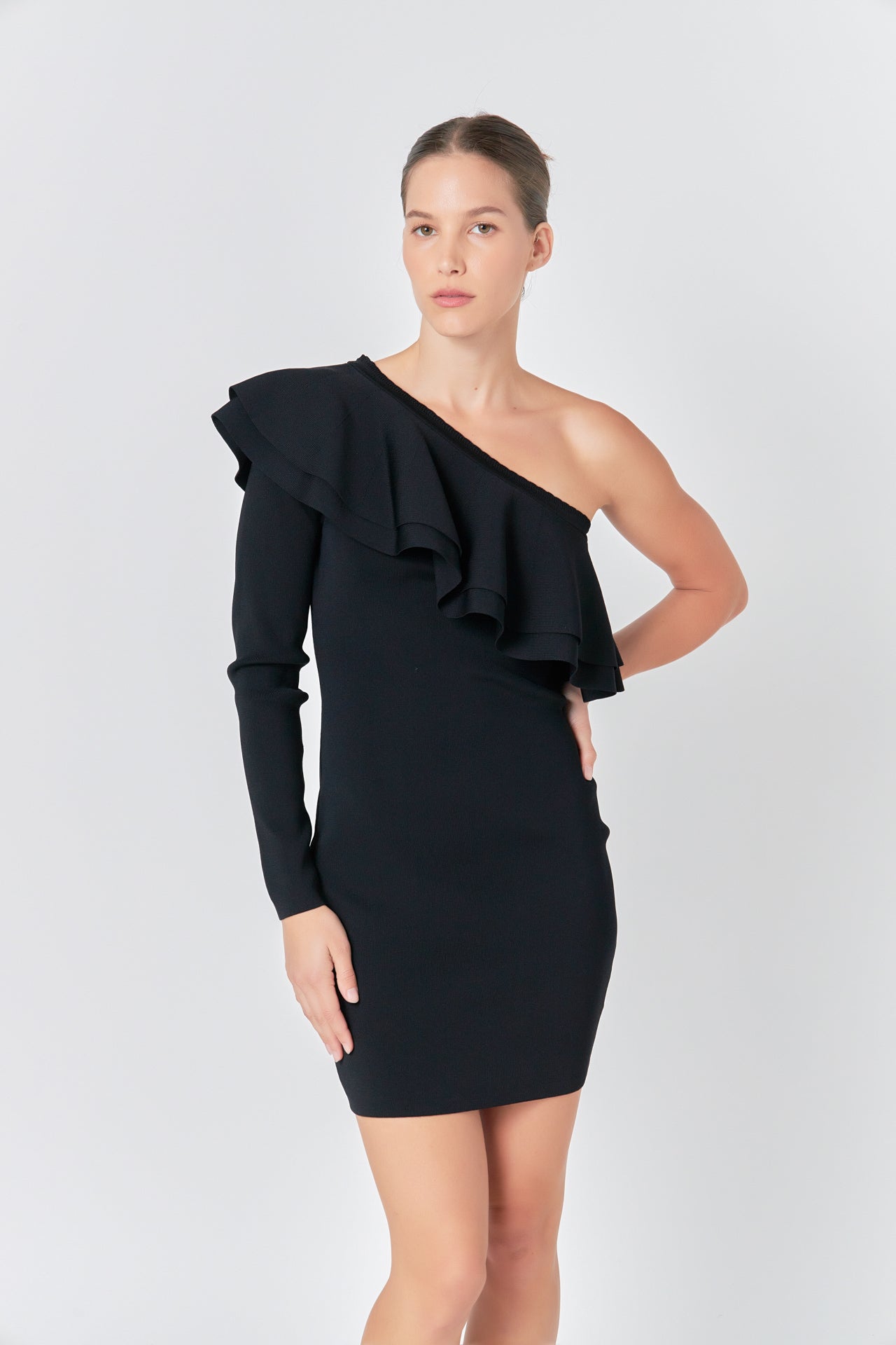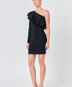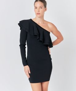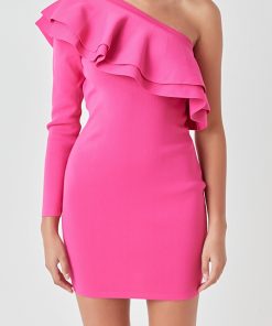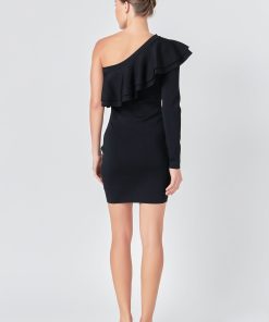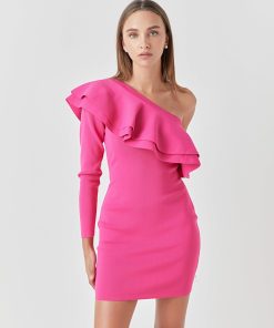 This One Shouldered Knitted Mini Dress is perfect for making a statement! Crafted with high quality knitted fabric, this fitted mini dress features an asymmetrical neckline and a gorgeous ruffle detail to complete the look. Its unique design and flattering cut will give you a stylish look you won’t forget. Show off your fashion sense with this amazing mini dress and be the envy of the party!