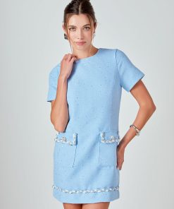 Our timeless classic Romy Chain Embellished Short Sleeve Tweed Mini Dress is one-of-a-kind. It features a chic mix braided trim that adds a bold, edgy twist and jewel buttons that give it a retro flair. Ideal for warmer days, this dress is mini in length and features short sleeves. Pair it with simple jewelry for formal events, or simple ballet flats for a shopping day. Explore our collection for more unique styles!