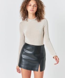 Our Embellished Slub Top is an eye-catching knit top that features a jewel-embellished neck band and long sleeves. The fitted design will flatter your silhouette while the unique detailing on the neckline will set you apart from the crowd. Perfect for a night out or a formal occasion this top is sure to be an eye-catching addition to your wardrobe. Make it yours and stand out for all the right reasons!