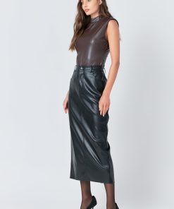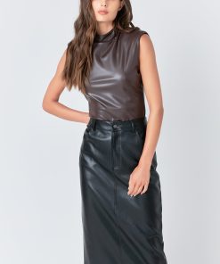 Introducing a sleek and modern twist on a classic style – our Leather Bodysuit. Crafted from high-quality leather, this show-stopping top exudes luxury and edginess. The mock neck design creates a bold look, while the sleeveless cut adds a touch of sophistication. Amp up the drama with the inclusion of statement shoulder pads, making this leather bodysuit a must-have for fashion-forward individuals. Perfect for a night out on the town or a daring addition to your everyday wardrobe, this versatile piece will turn heads and leave a lasting impression. Don’t miss out on this must-have leather essential.