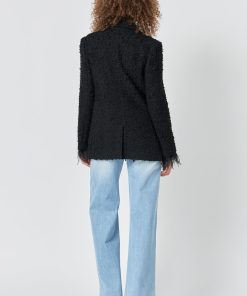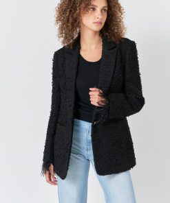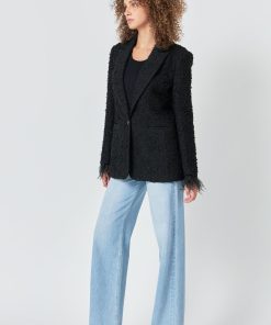 Elevate your style with this chic blazer. With a touch of feather trim, this tweed blazer is perfect for dressing up any look. The standard fit ensures that you’ll feel comfortable all day long. Whether you’re headed to the office or out on a date, this blazer will have you looking sharp.