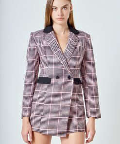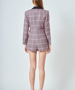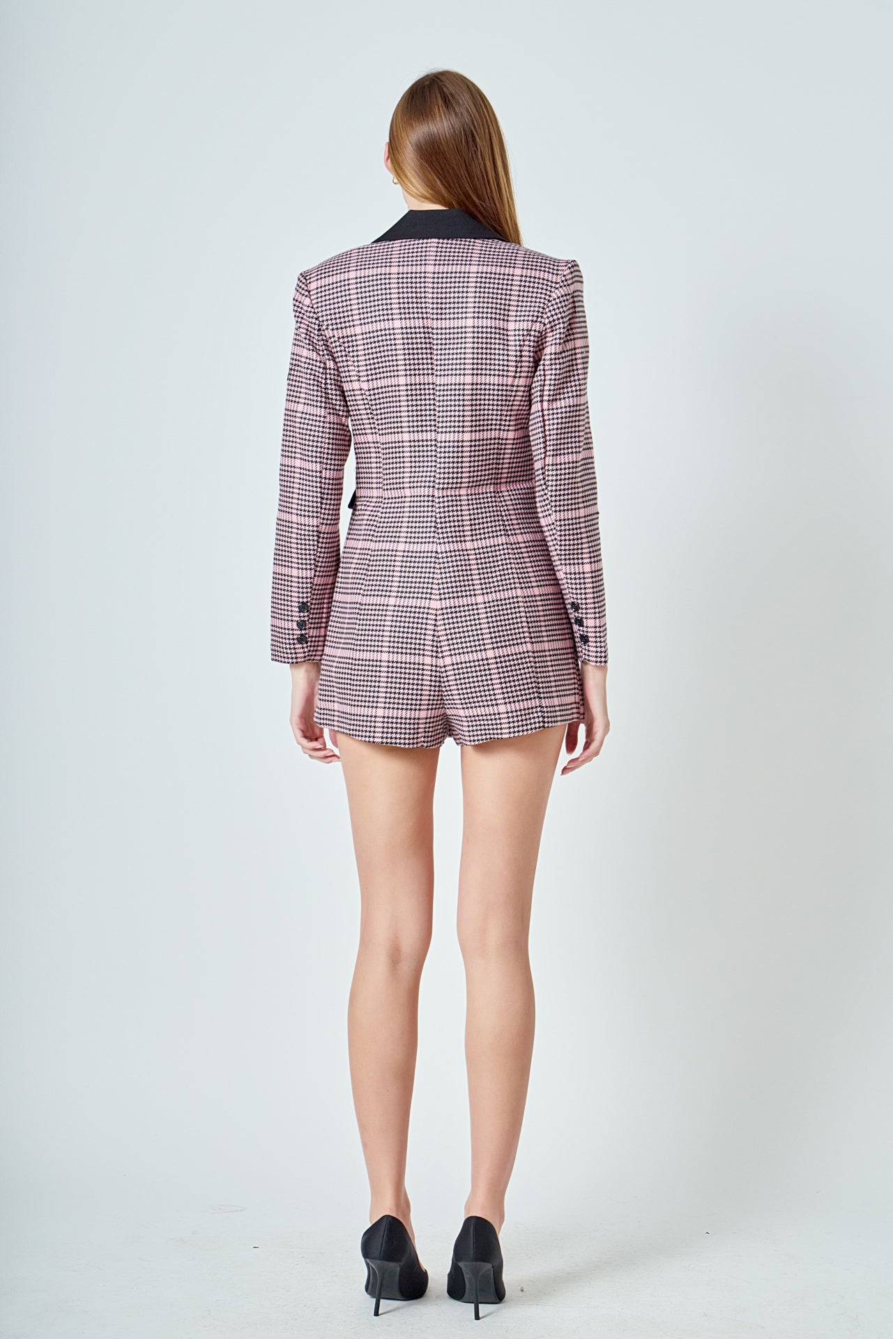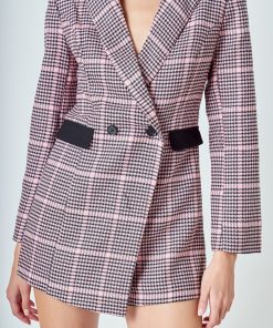 This Houndstooth Contrast Romper is a striking statement piece designed to elevate your wardrobe. Crafted from sequin tweed, it offers a rich texture and subtle shimmer that catches the light beautifully. The timeless double-breasted silhouette creates a tailored, polished look, while the contrast skinny lapels add a modern edge. Front pocket flaps lend a structured detail, balancing elegance with functionality. Perfect for special occasions, this romper transitions seamlessly from evening events to upscale gatherings, ensuring you stand out in sophisticated style. Pair it with sleek heels and minimal jewelry for a refined, head-turning ensemble.