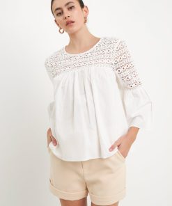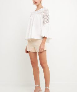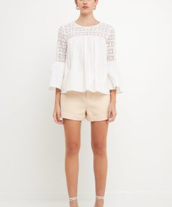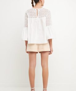 Look stylish yet feminine in this Lace with Poplin Bell Sleeve Blouse! This sophisticated and fashionable blouse is made up of delicate lace and features a trendy bell sleeve design for a stunning look. Its lightweight fabric construction allows for comfortable wearing and proper air circulation. Versatile and feminine, this blouse is perfect for both day and night. Get ready to show off your best side with this must-have blouse!