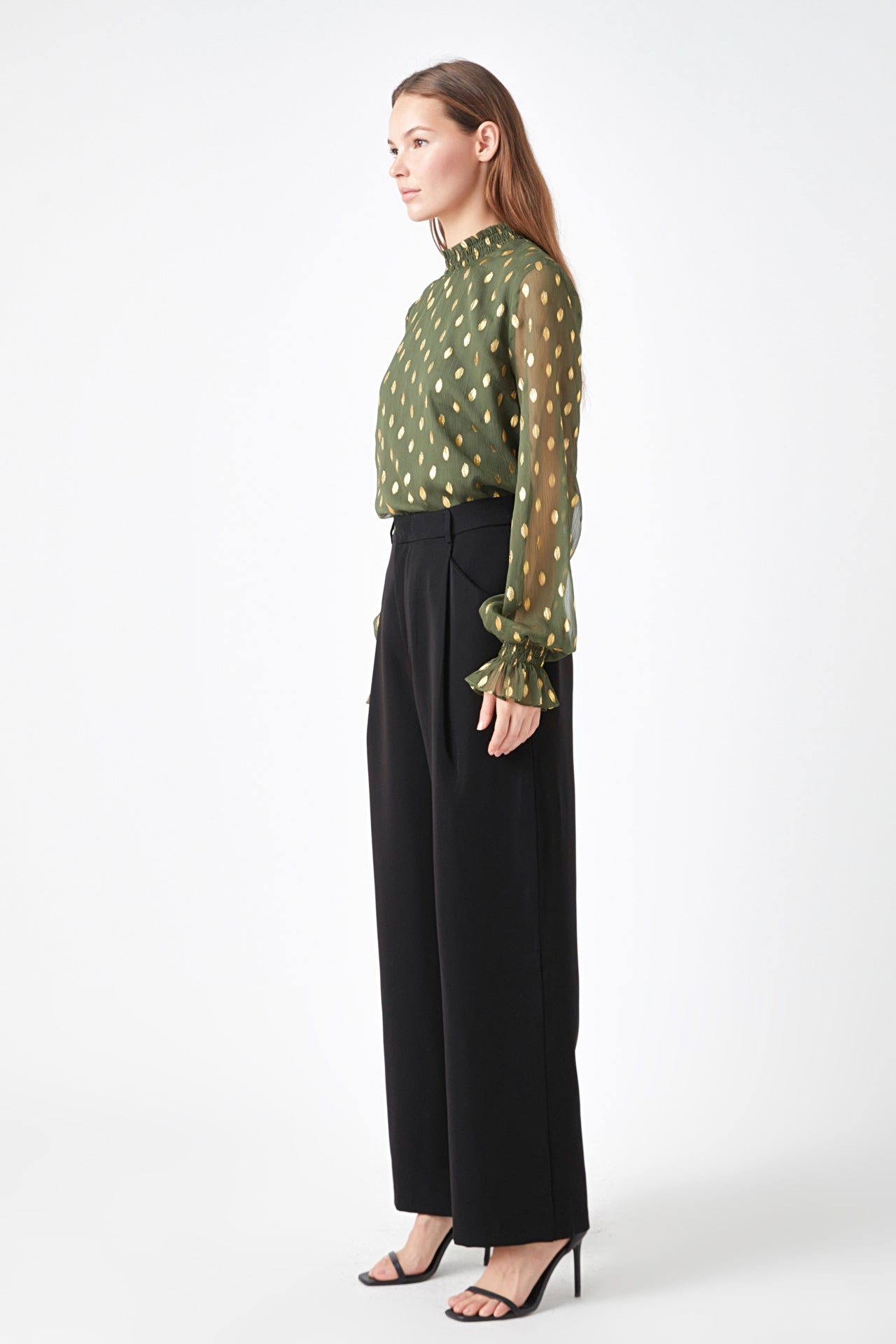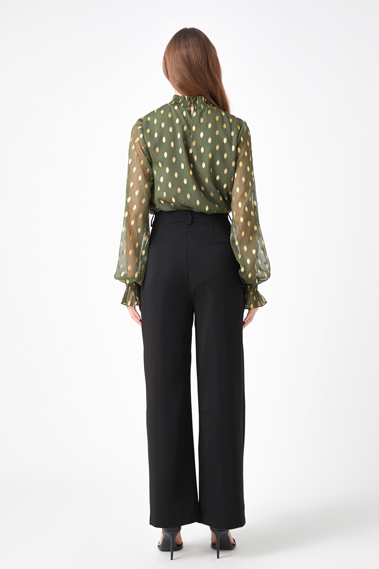 This elegant chiffon blouse features a metallic polka dot print. With feminine touches like ruffled sleeve hems and a back keyhole detail, it’s the perfect blouse to dress up any look with ease. Tuck this blouse into your favorite jeans, high-waisted pants, or skirt, and you’ll instantly create a chic, sophisticated look.