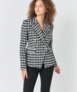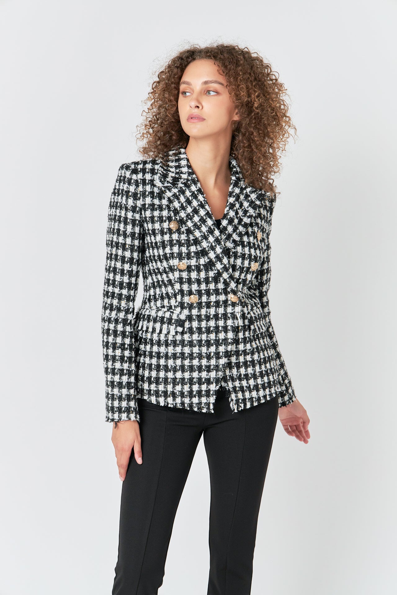 Capture the timeless appeal of tweed with our Checked Blazer. This luxe blazer is crafted with double-breasted buttons front flap pockets and a vent at the back offering a modern twist on traditional tailoring. Long sleeves exude sophistication and make it perfect for transitional styling. Reach new heights in sartorial elegance with this refined piece.