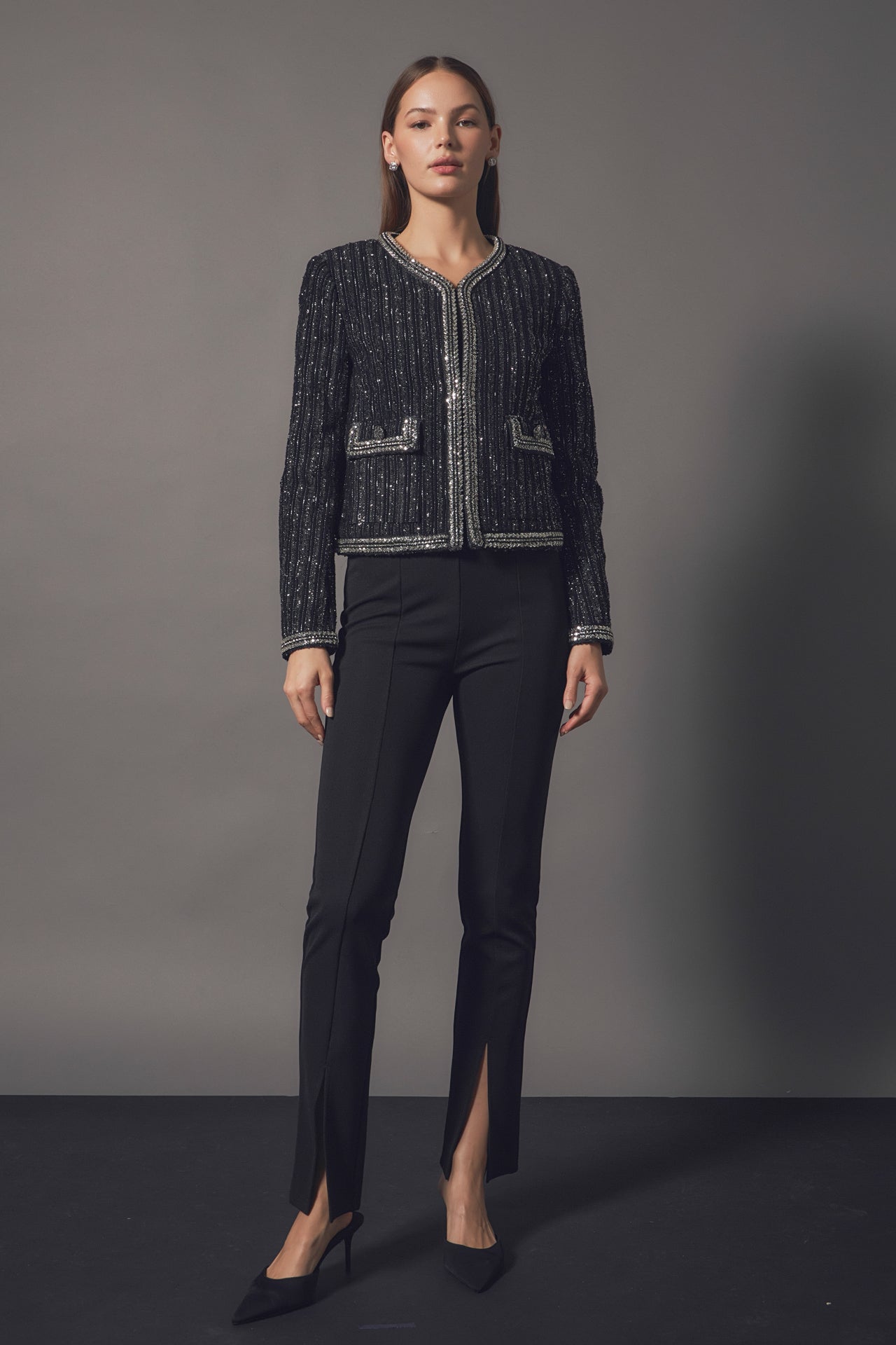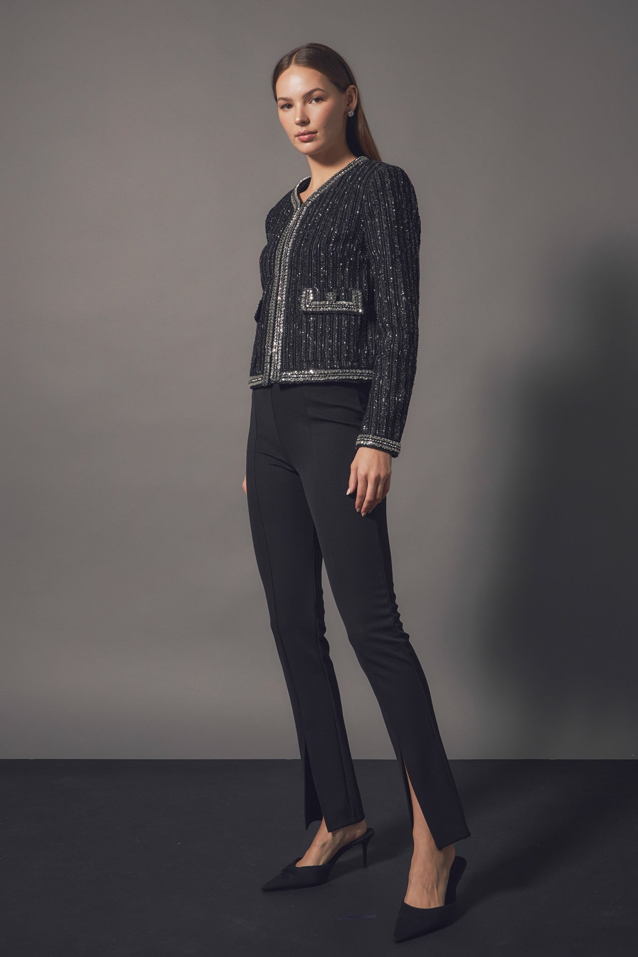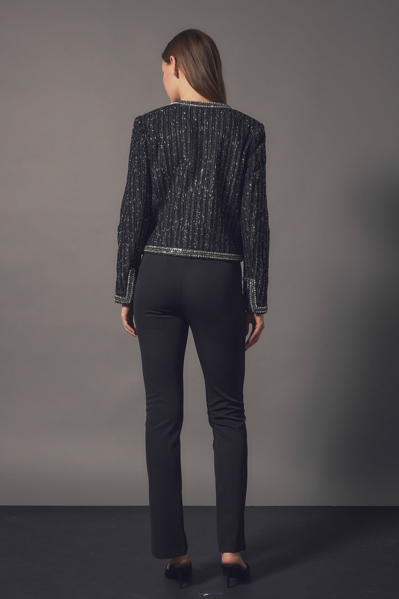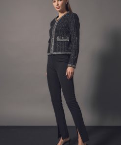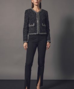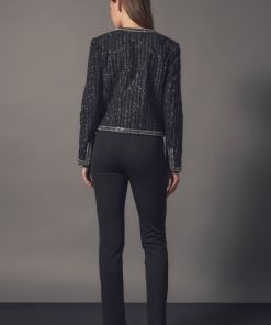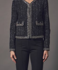 This jacket is truly a masterpiece. The details and expert craftsmanship that created this piece will be noticed and appreciated by any fashion lover. The unique fabric feature tinsel accents that are bold yet sophisticated. The mini beads and sequins trim combined with the jeweled buttons help you shine when you walk into a room. The shoulder pads give this cropped jacket the structure it needs. Plus, the luxurious lining will keep you comfortable all night long.