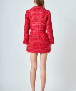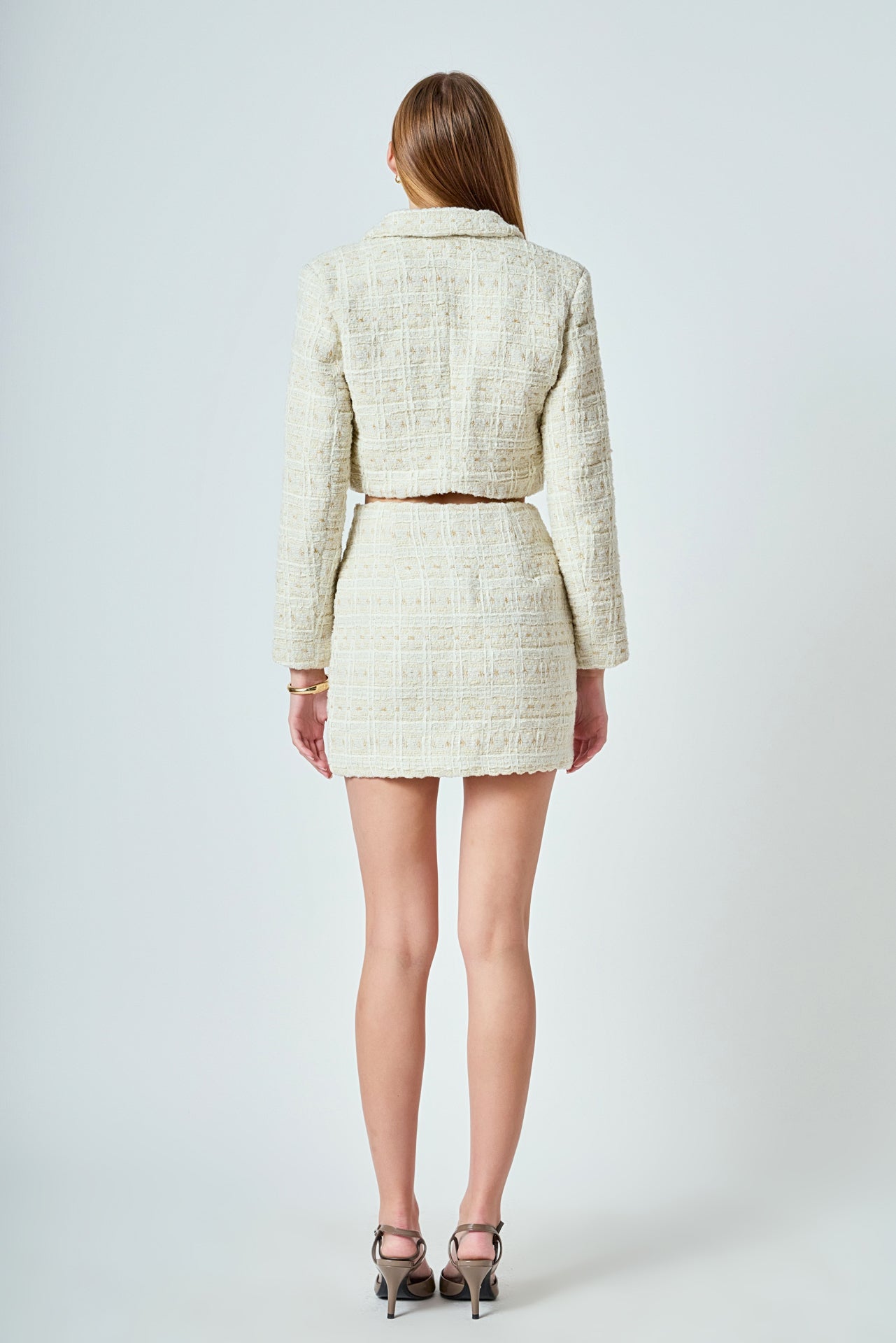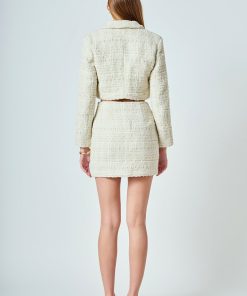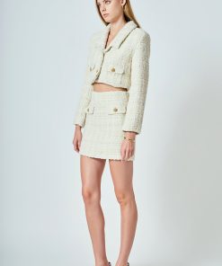 This cropped jacket is constructed with high-quality tweed and detailed gold buttons. Also, the shoulder pads add a structured element to the piece, so it lays on you beautifully.