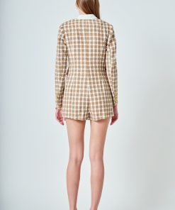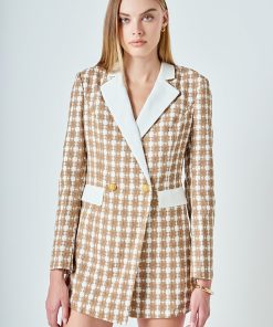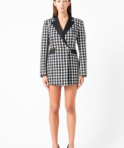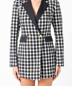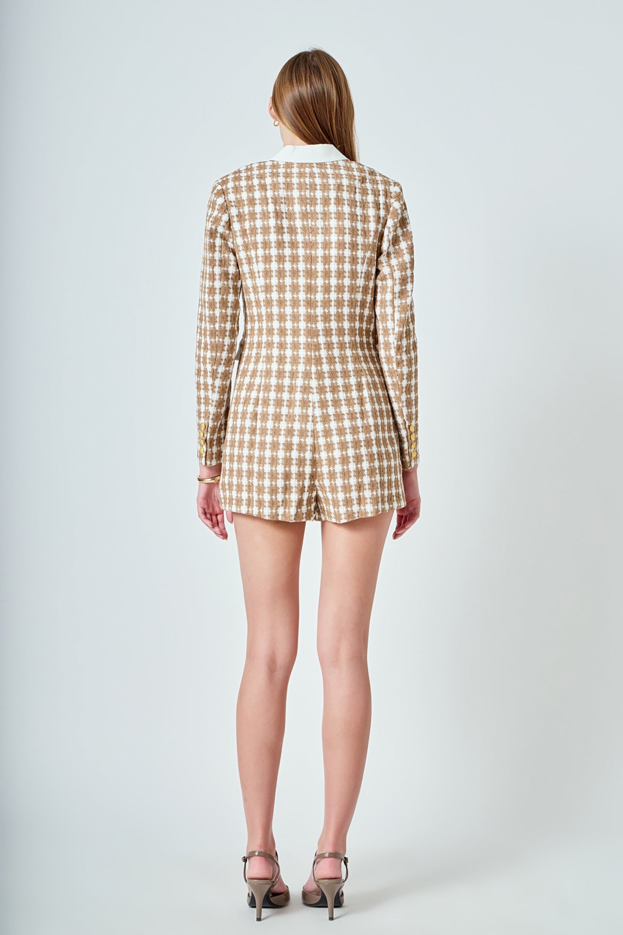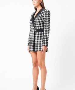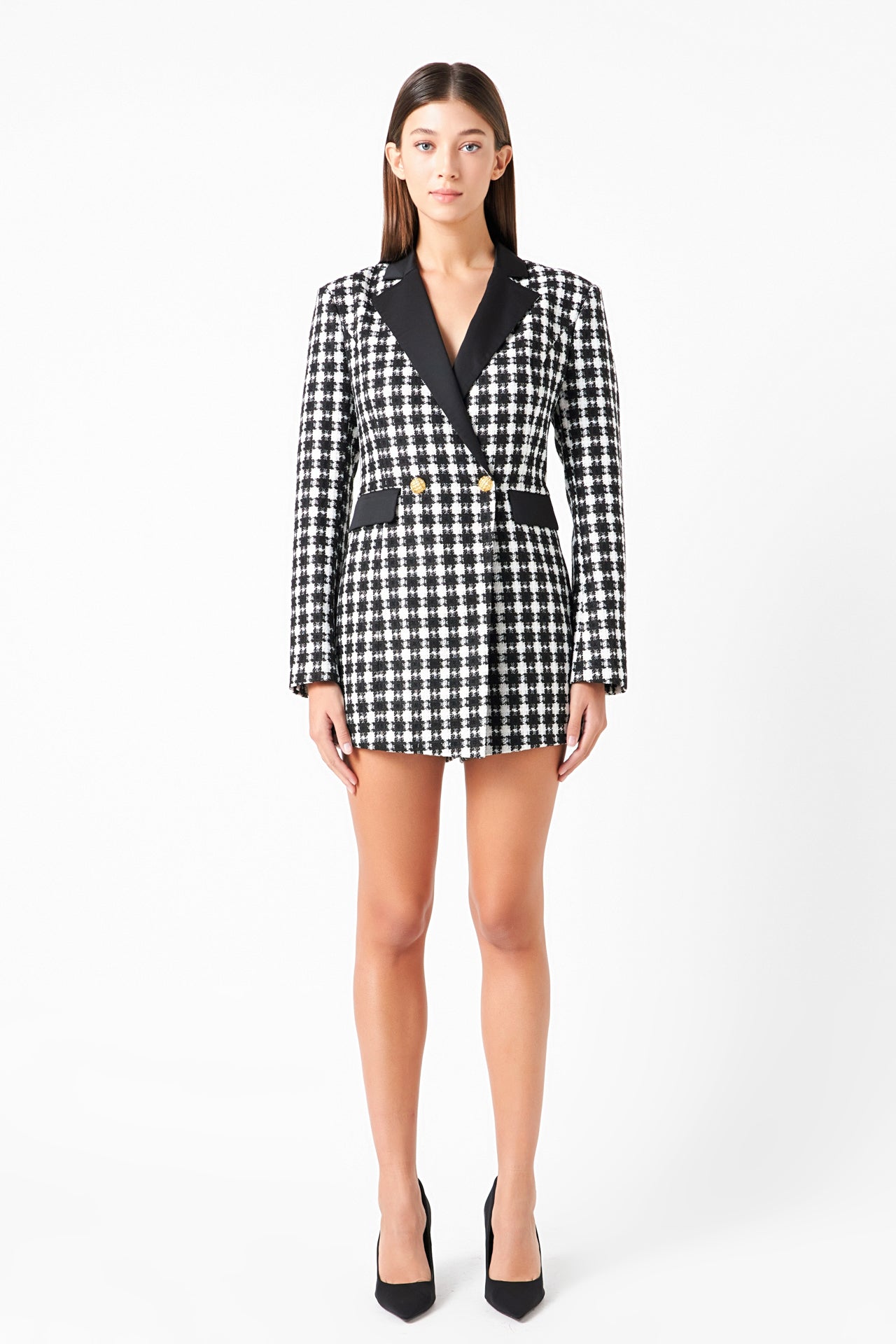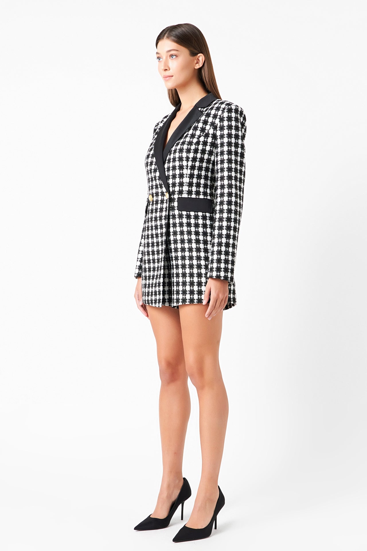 Look refined in the Houndstooth Blazer Romper – the perfect mix between work and play! Our romper features a double breast button a solid lapel and long sleeves. The unique black and white houndstooth pattern adds just the right amount of sophistication and panache to your look. Upgrade your closet with this must-have piece and be sure to stand out from the crowd!