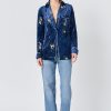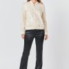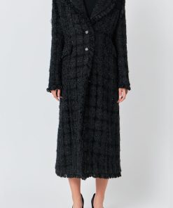 This luxurious tweed coat has lined pockets, jeweled buttons, and fringed edges. It’s finished with a large lapel collar.