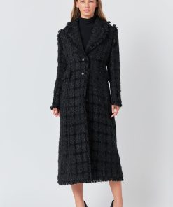 This luxurious tweed coat has lined pockets, jeweled buttons, and fringed edges. It’s finished with a large lapel collar.
