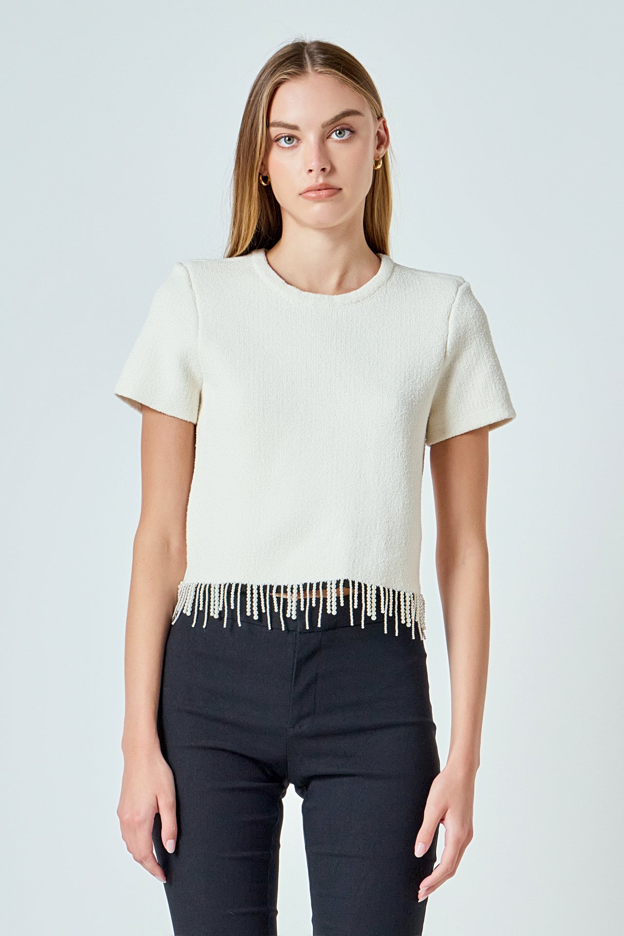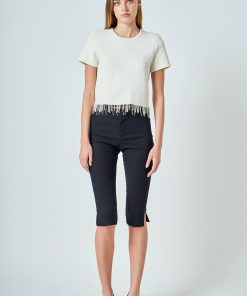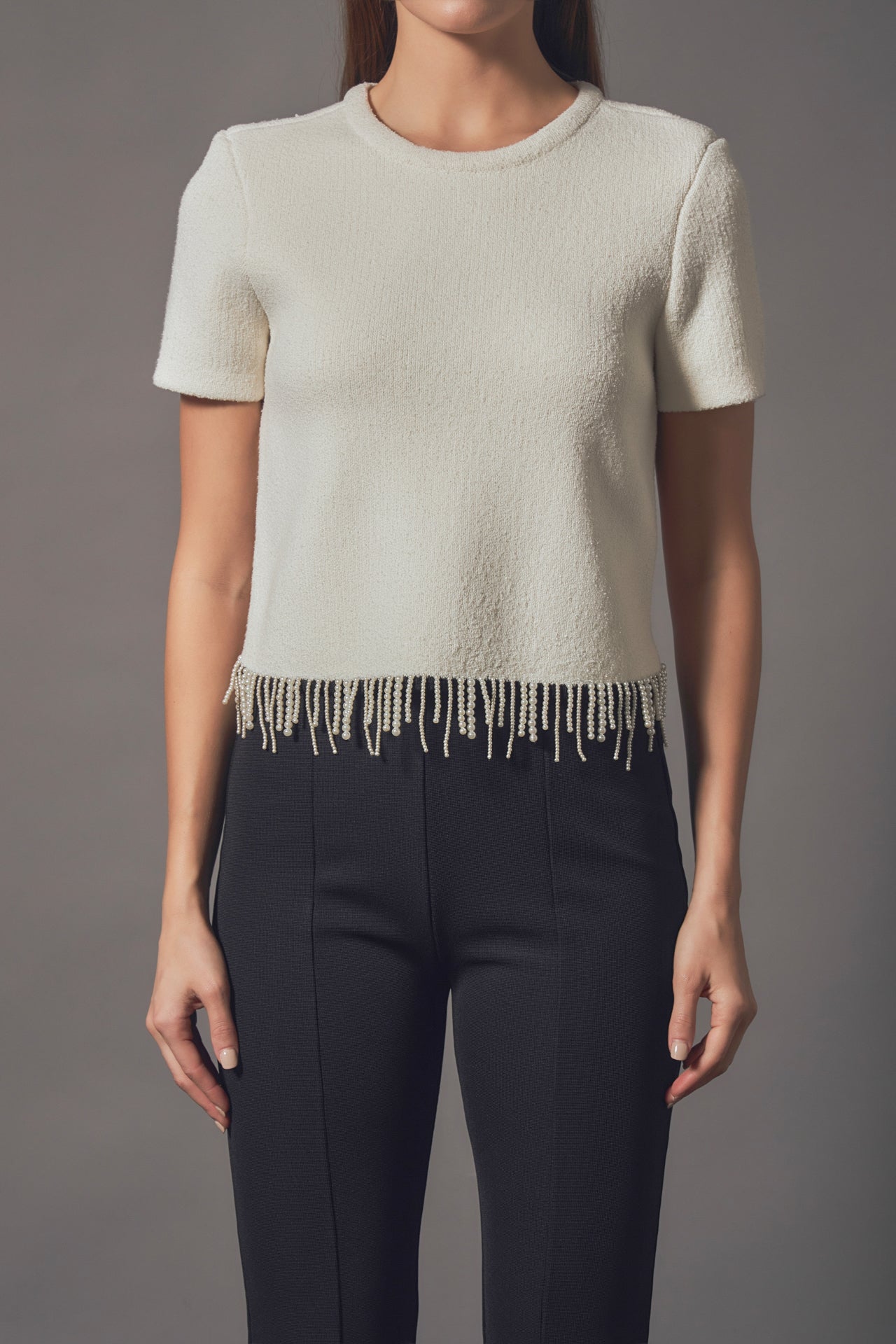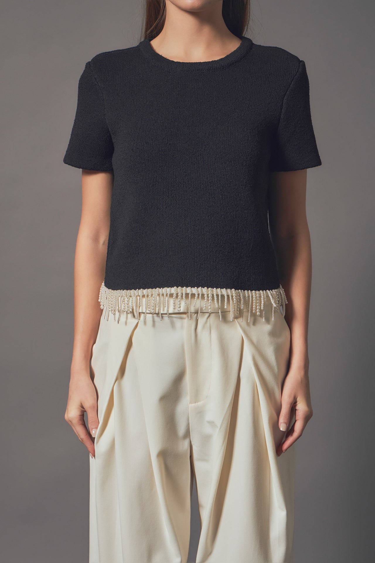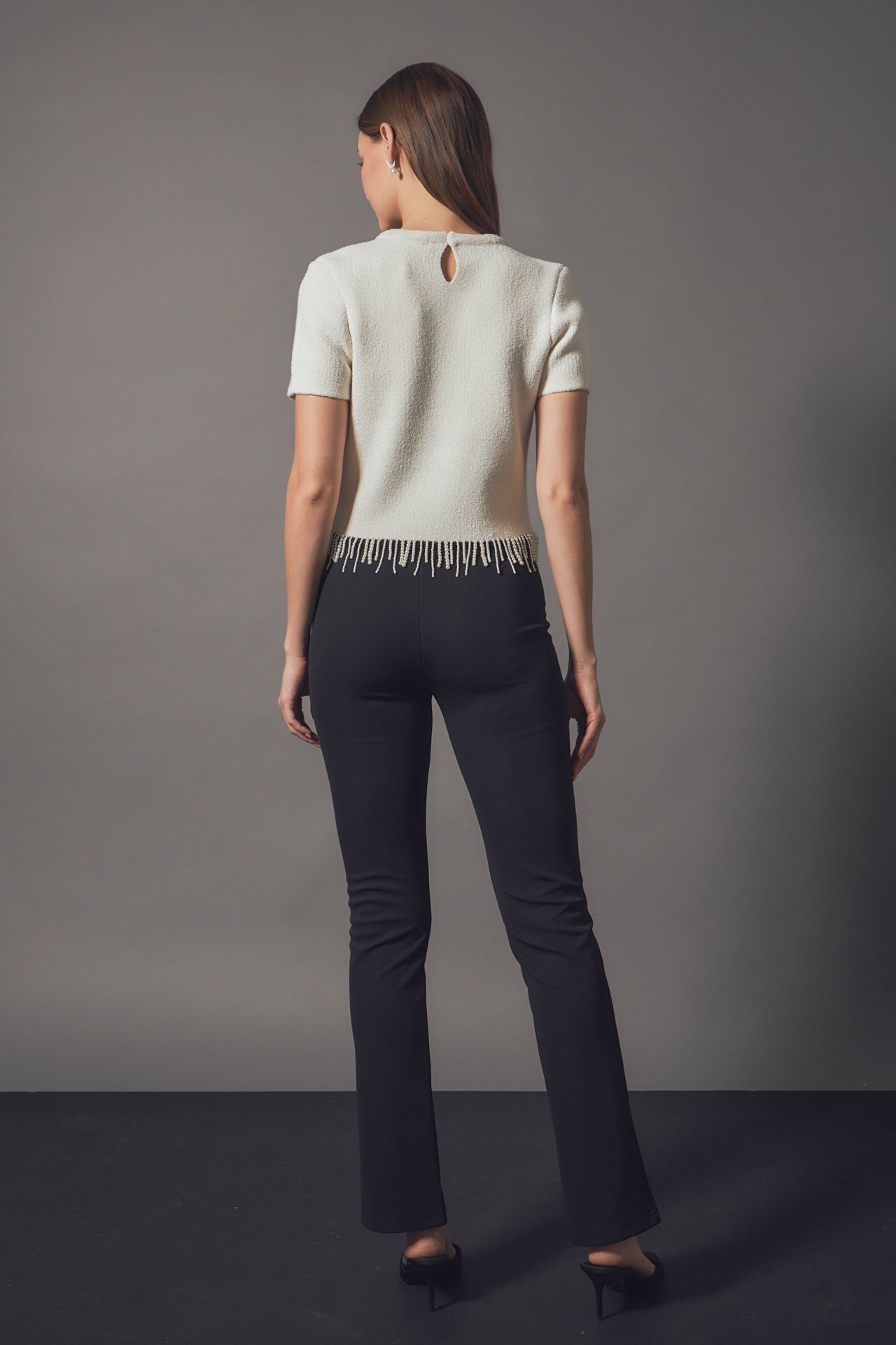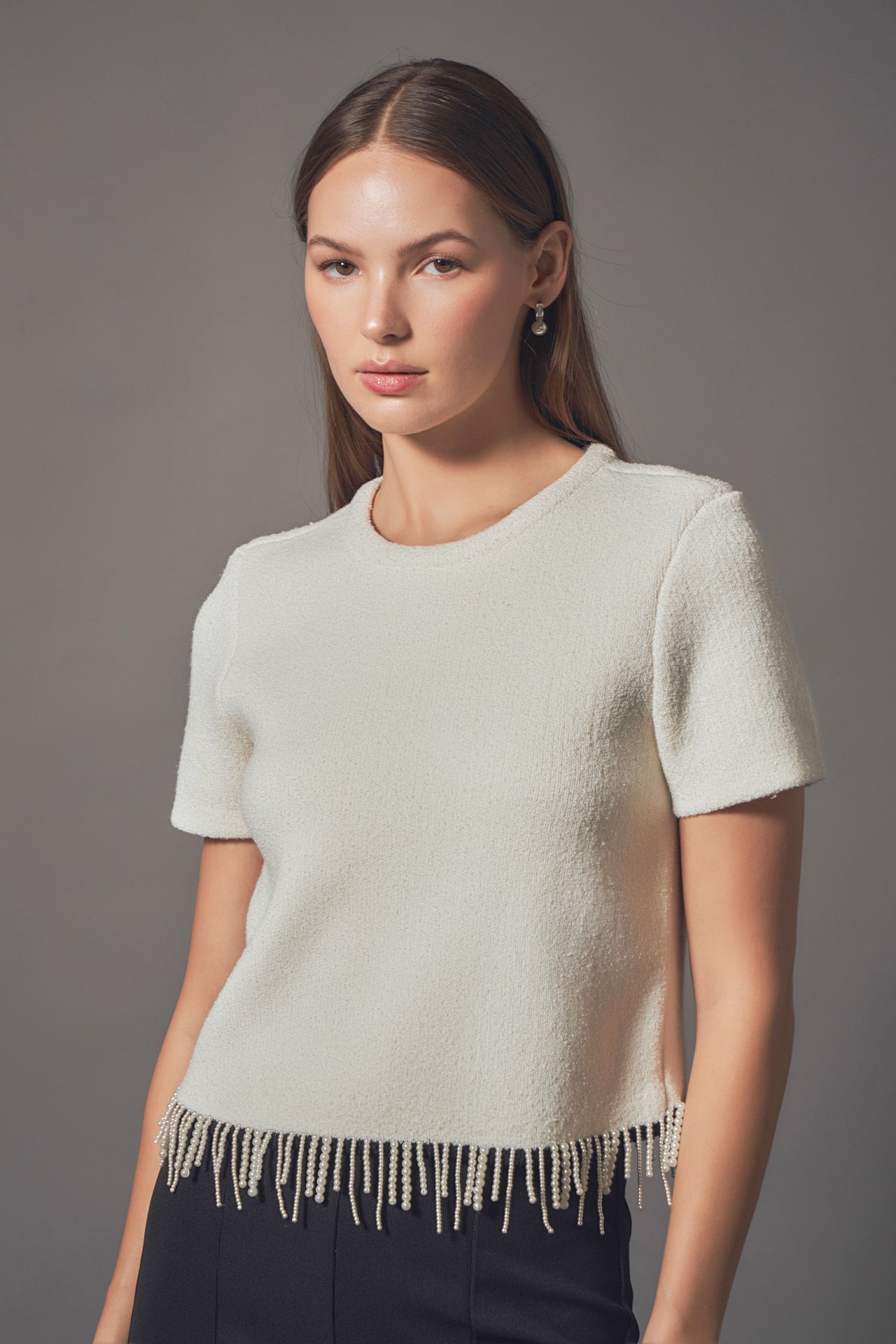 Elevate your everyday style with our Pearl Trim Knit Top, a perfect blend of comfort and sophistication. Crafted from a soft, breathable fabric, this versatile top keeps you feeling cozy while maintaining a polished look. The classic round neckline, short sleeves, and delicate pearl trim details add a refined touch, while the back keyhole button closure lends a graceful, feminine finish. Designed to flatter with its timeless silhouette, this piece is ideal for both casual days and more elevated occasions. Make a subtle yet refreshing style statement every time you wear it.