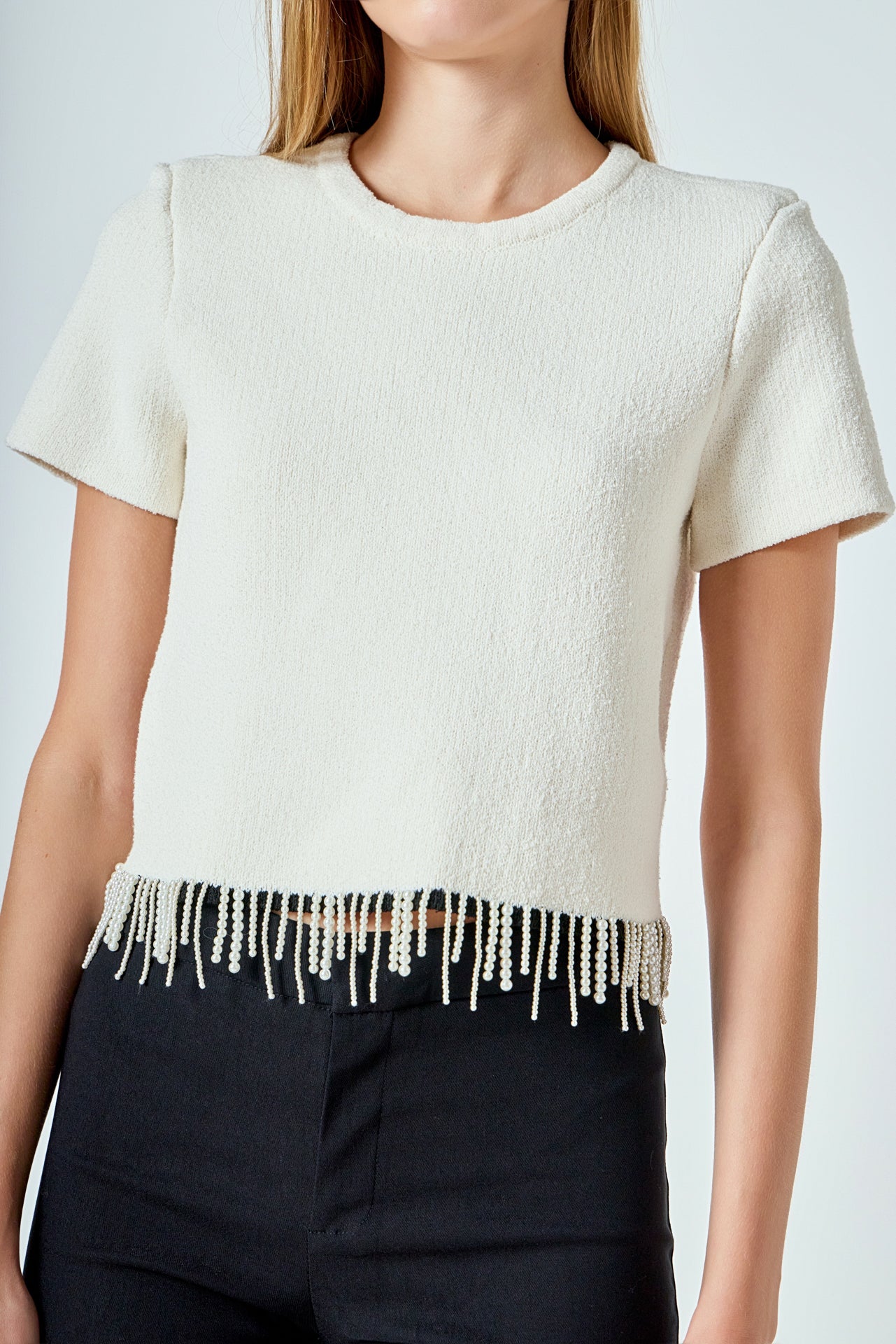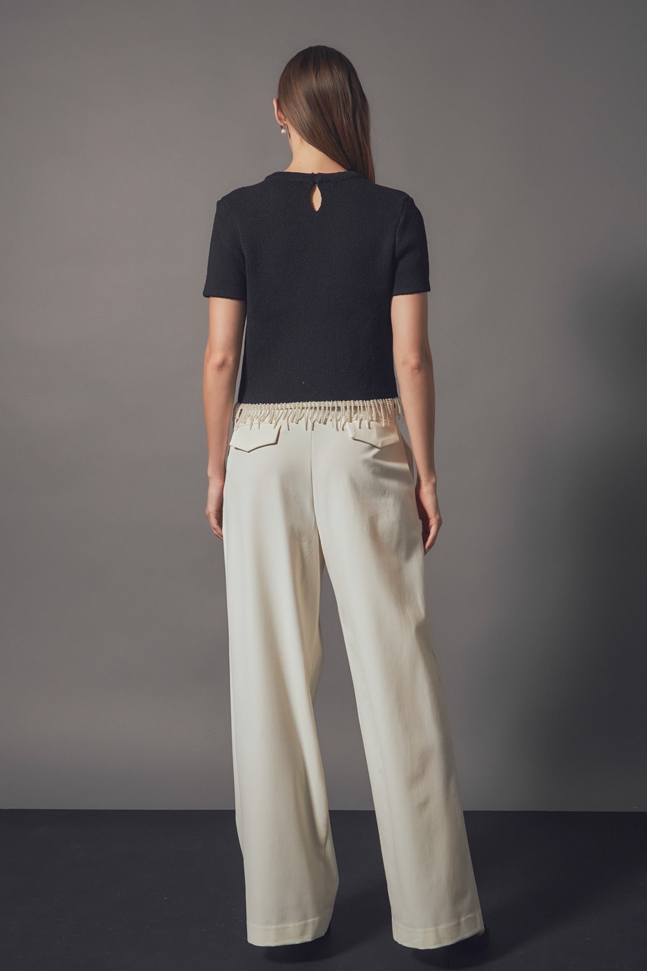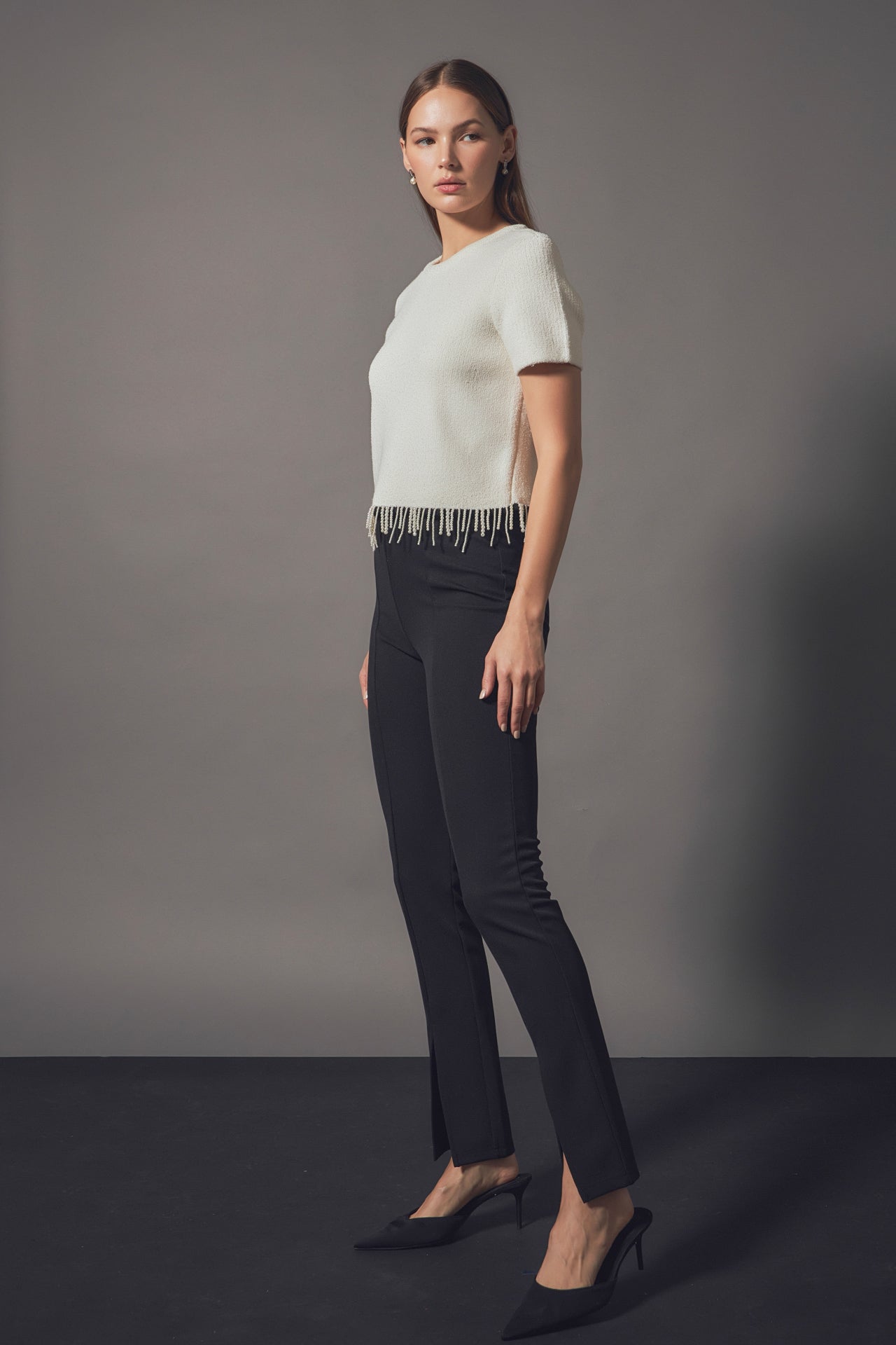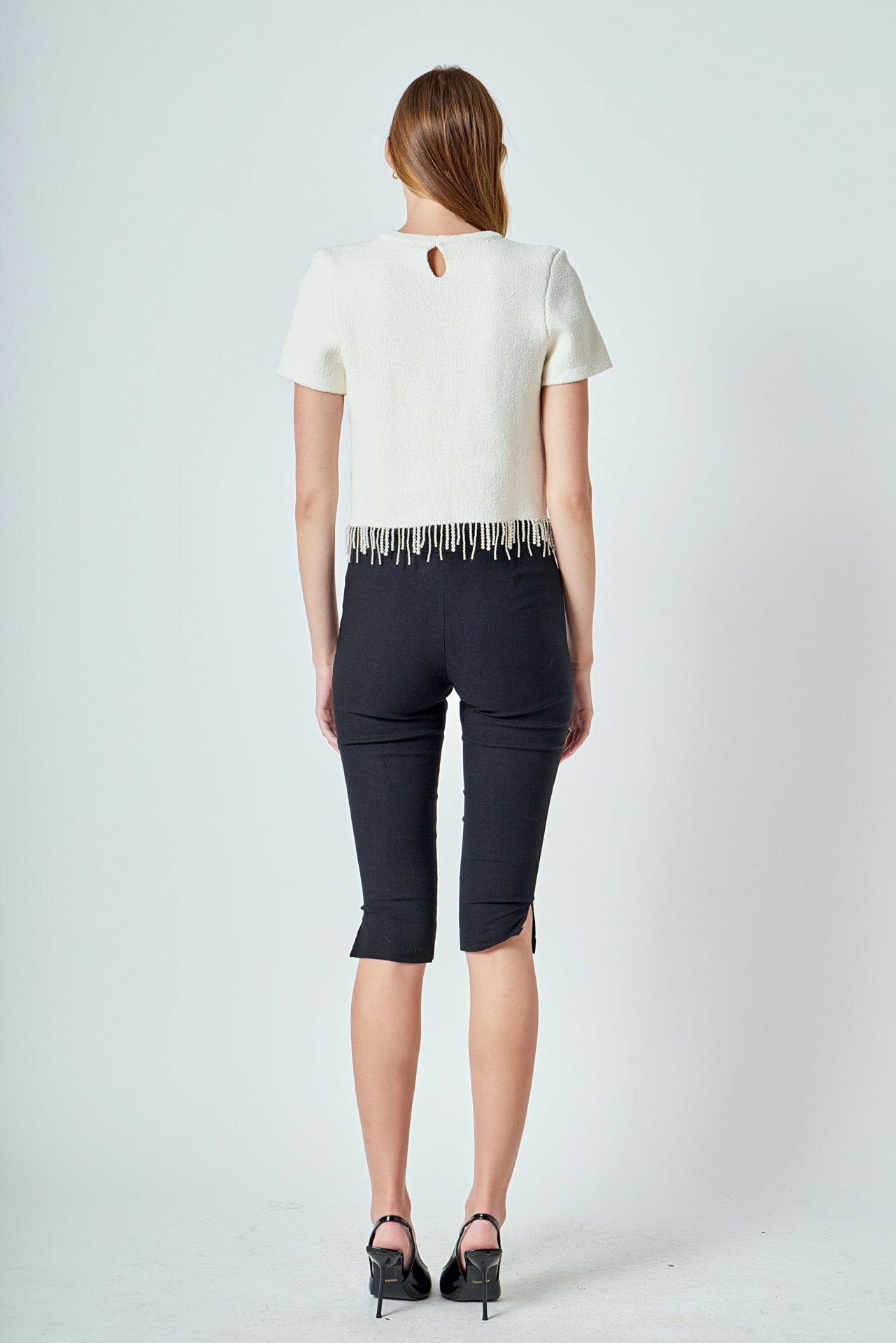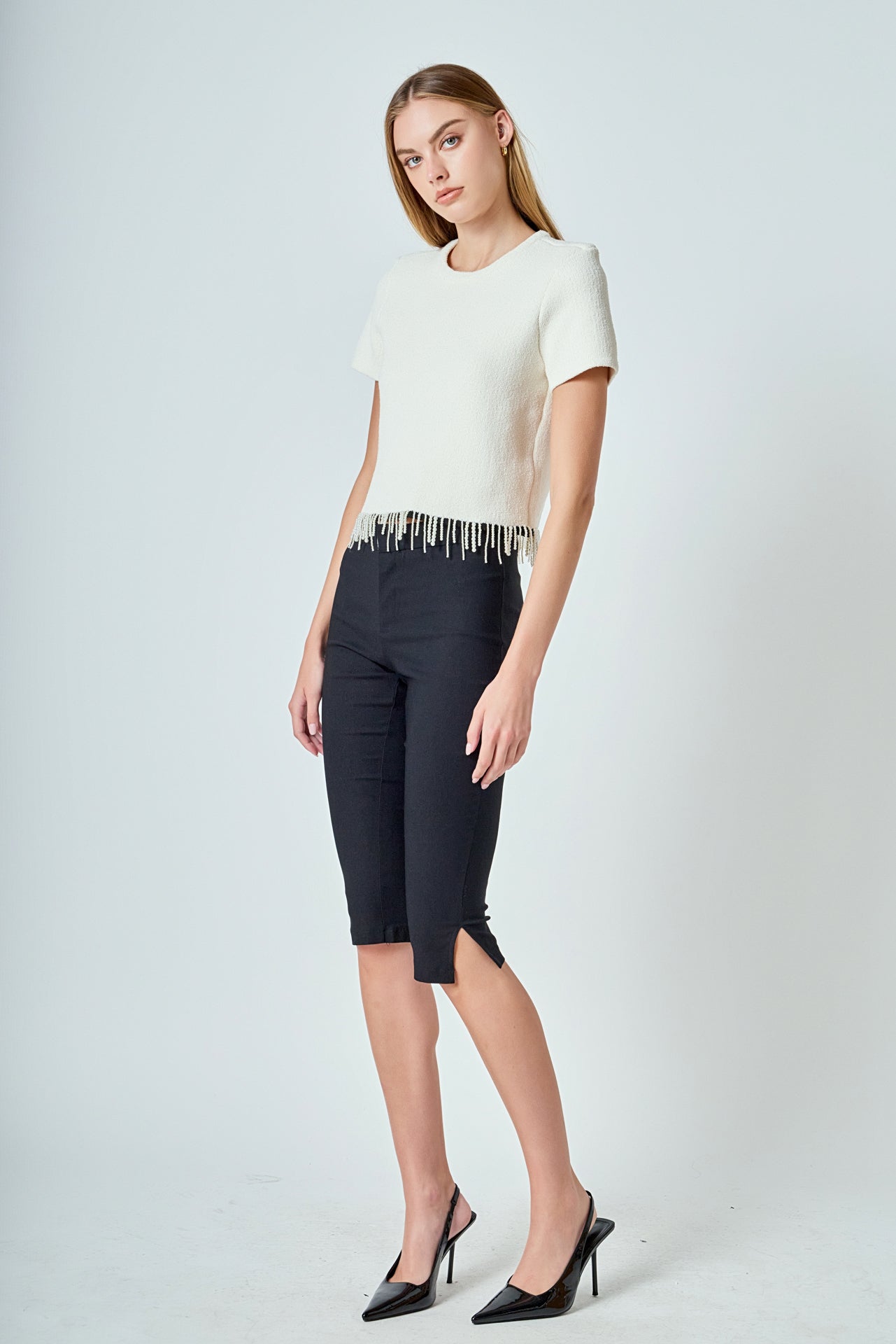 Elevate your everyday style with our Pearl Trim Knit Top, a perfect blend of comfort and sophistication. Crafted from a soft, breathable fabric, this versatile top keeps you feeling cozy while maintaining a polished look. The classic round neckline, short sleeves, and delicate pearl trim details add a refined touch, while the back keyhole button closure lends a graceful, feminine finish. Designed to flatter with its timeless silhouette, this piece is ideal for both casual days and more elevated occasions. Make a subtle yet refreshing style statement every time you wear it.
