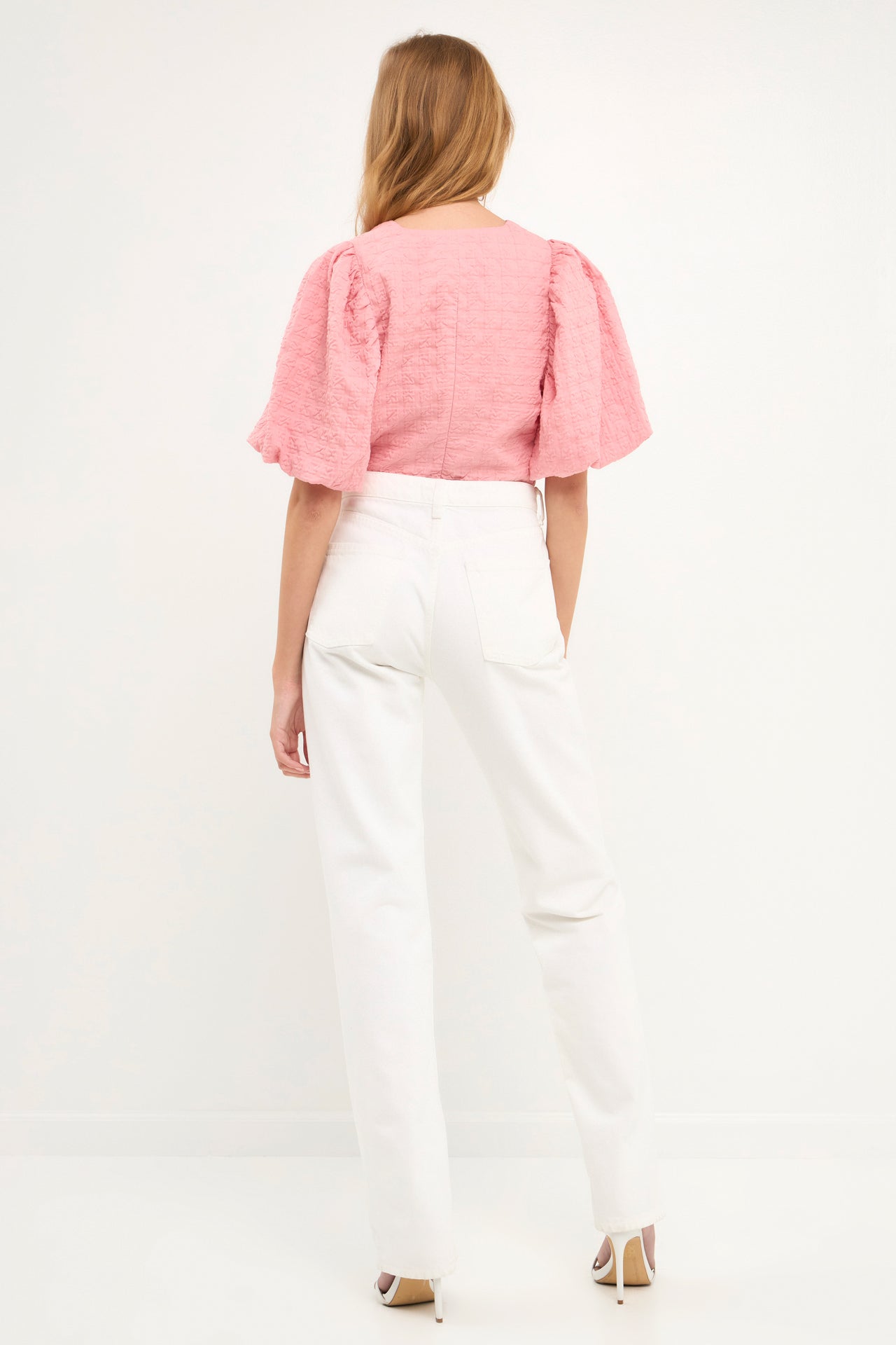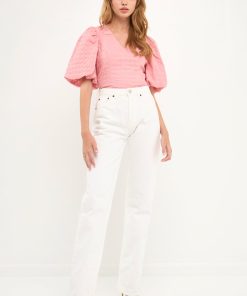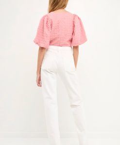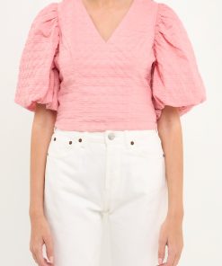 This Puff Sleeve Check Jacquard Top is perfect for a casual day out. The pretty pink color and puff sleeves make it feminine and fun, while the check pattern adds a touch of sophistication. It’s crop top style makes it the perfect choice for hot summer days.