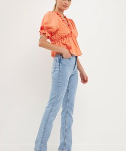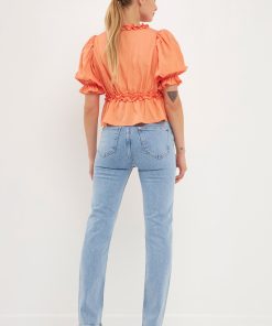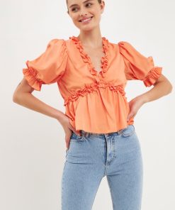 Endless Rose Women’s Ruffle Detail Top With Puff Sleeves | Tangerine