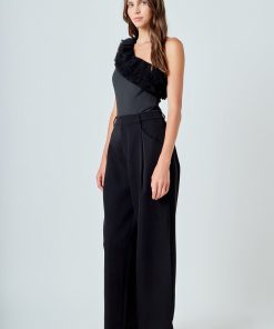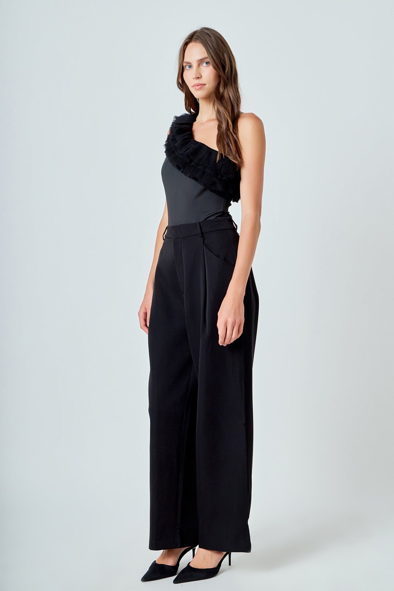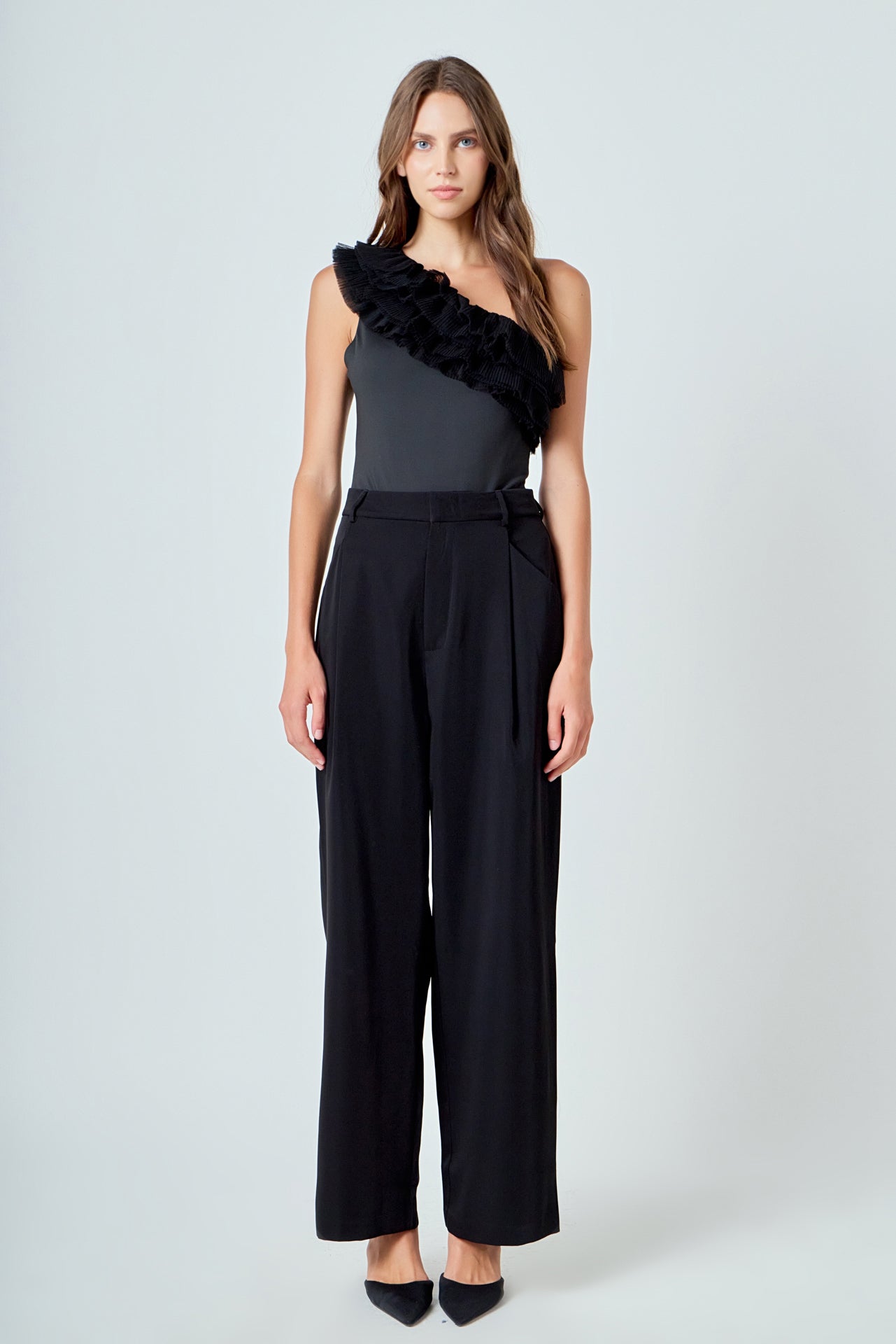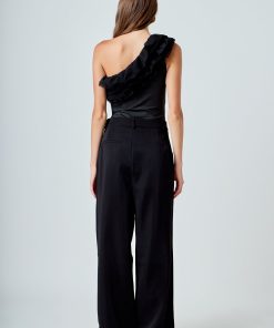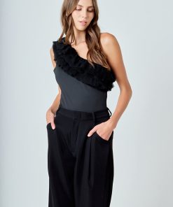 Take your style to the next level with this ruffled asymmetrical bodysuit. No need to worry about tucking or readjusting. This sleek fitted bodice has a striking asymmetrical shoulder and a delicate ruffled neckline for a touch of sophistication. It’s the perfect way to add an unexpected twist to your wardrobe morning noon or night!