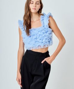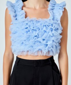 This Ruffled Shoulder Strap Tulle Top will add a bit of class and sass to your wardrobe. Featuring a cropped length sleeveless top and delicate ruffled shoulder straps it’s the perfect addition to any outfit. Add it to a skirt or dress or simply style it with jeans and heels.