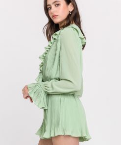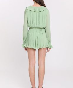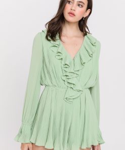 Dress up in style with our Ruffled V-neck Romper. This trendy romper features a pleated ruffle at the neck line for a touch of feminine flair, along with long sleeves to keep you stylishly covered. With elastic at the sleeves and waist, this romper offers a flattering and comfortable fit. The pleated detailing at the body adds texture and dimension to this must-have romper. Perfect for any occasion, this romper will have you looking effortlessly chic. Shop now and make a statement with our Ruffled V-neck Romper that will surely turn heads.