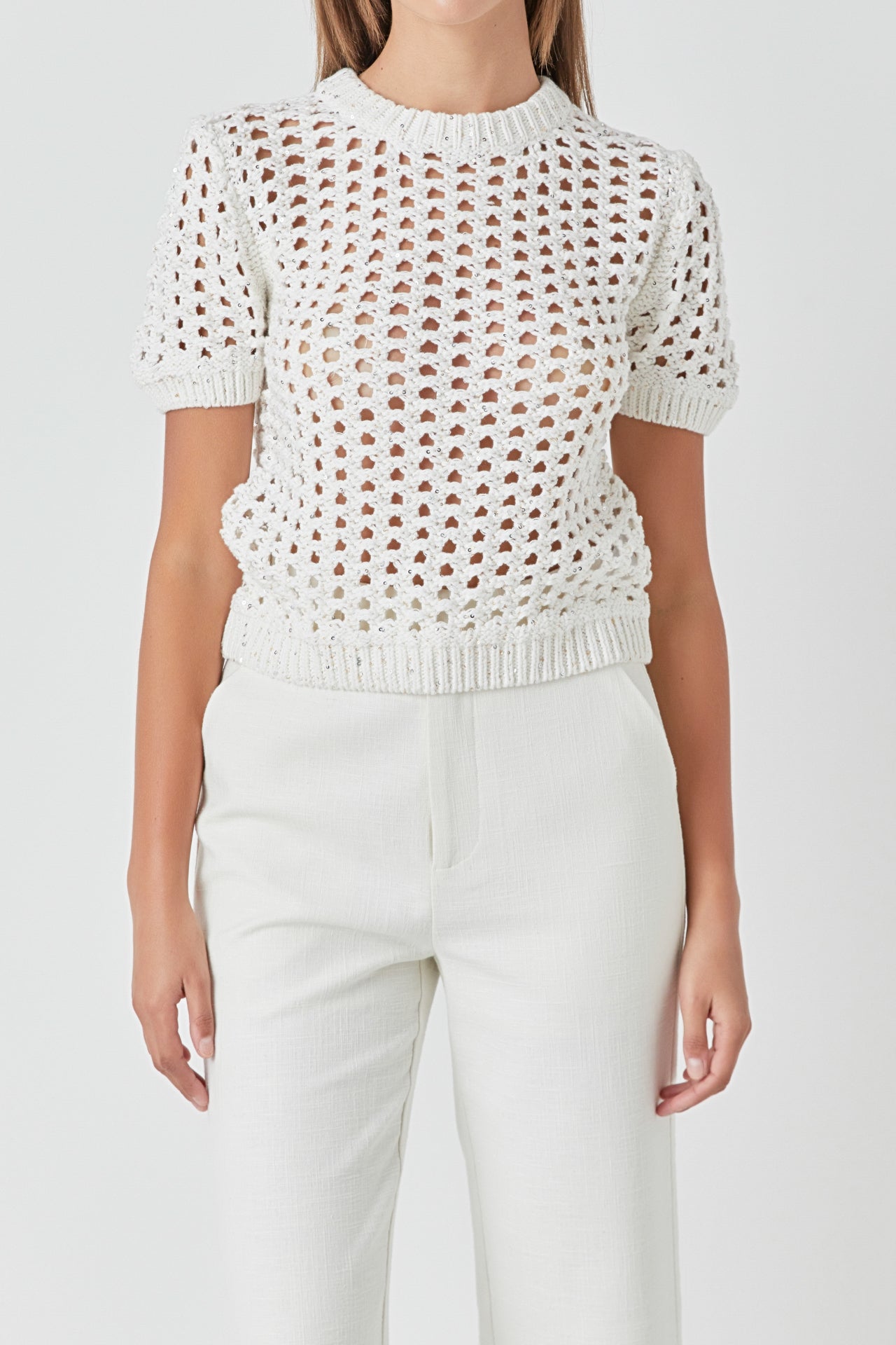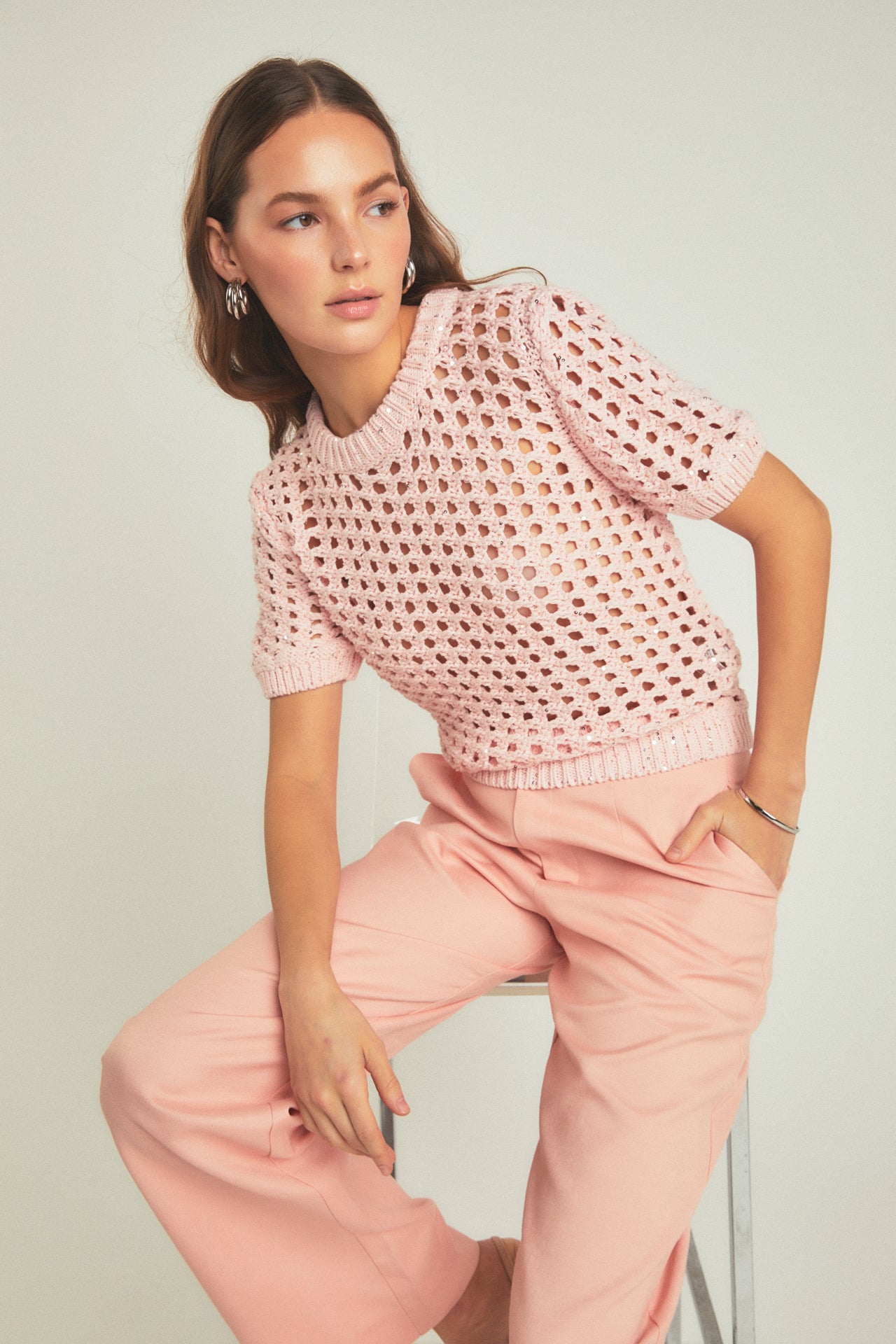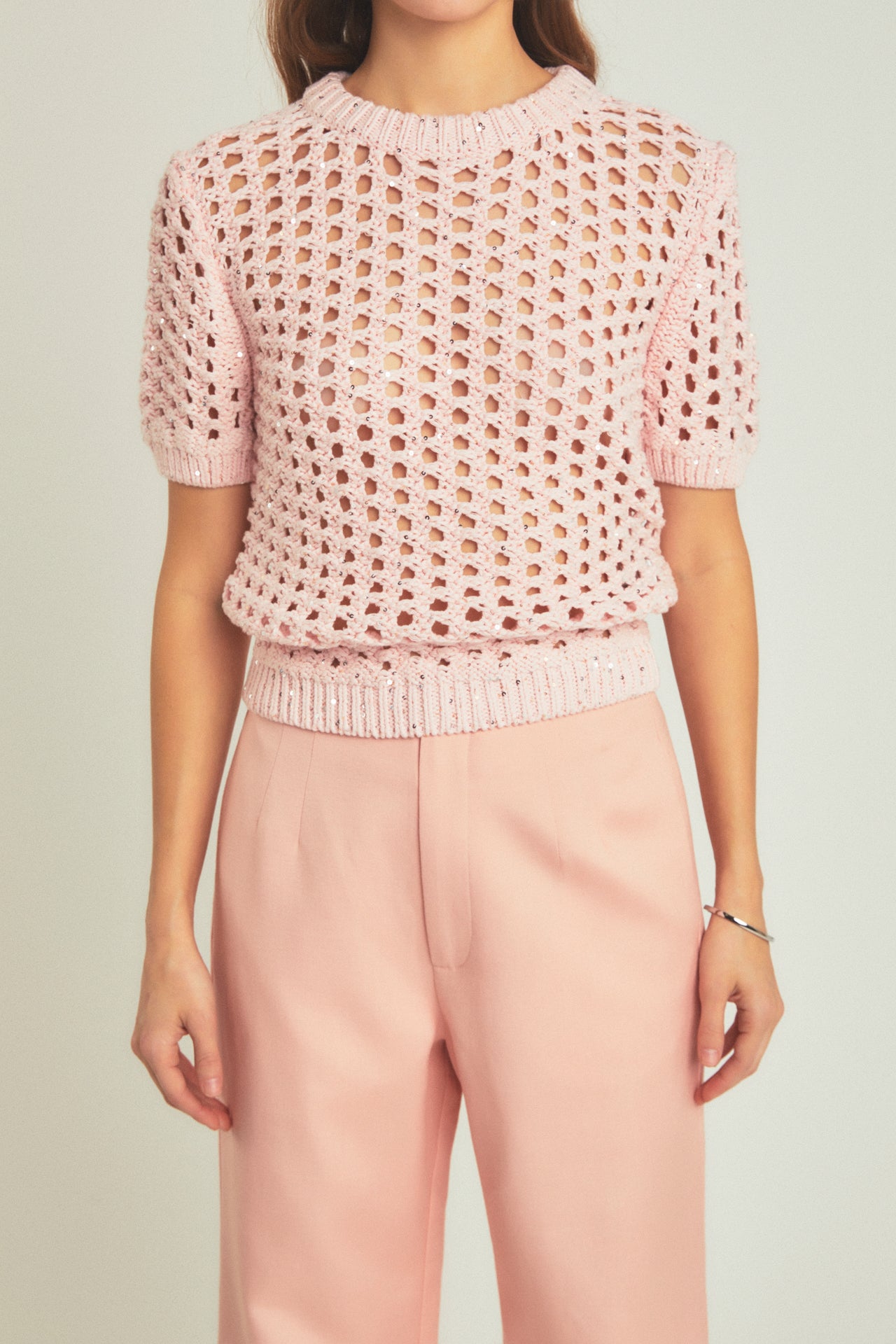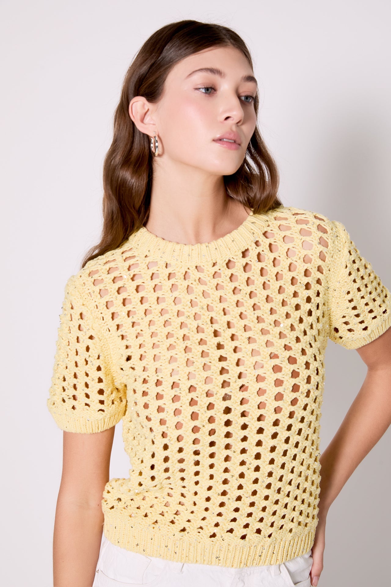 Turn heads in our Sequins Knit Top, crafted with high-quality Lurex yarn that shimmers with every move. The round neckline adds a touch of elegance, while the ribbed details create a flattering fit. Perfect for any occasion, this top features short sleeves to keep you cool and comfortable. Pair it with your favorite jeans for a casual look or dress it up with a skirt for a night out. With its eye-catching sequins and versatile design, this top is a must-have in your wardrobe. Shop now and add a touch of sparkle to your outfit!