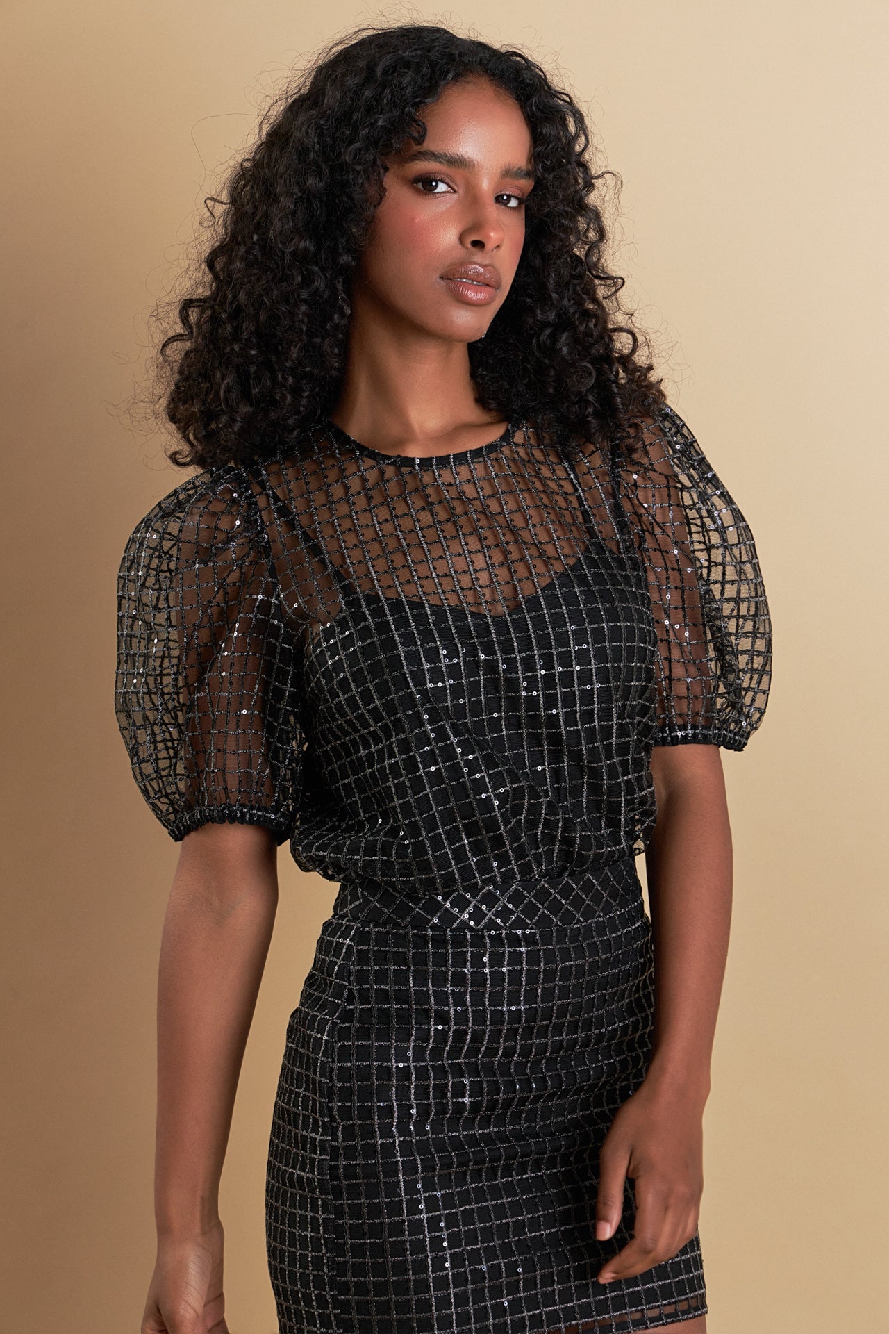 Make a fashionable statement in this chic feminine and stylish Sequins Mesh Grid Top. Featuring a round neckline back neck button closure short puff sleeves and an adjustable strapped cami this top is perfect for any stylish occasion. Capture attention with the unique design that will surely be an eye-catching conversation piece. Express your unique style with this versatile and affordable sequin mesh grid top.