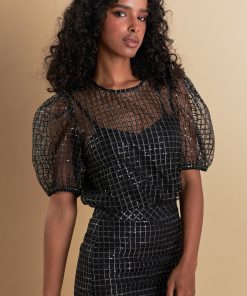 Make a fashionable statement in this chic feminine and stylish Sequins Mesh Grid Top. Featuring a round neckline back neck button closure short puff sleeves and an adjustable strapped cami this top is perfect for any stylish occasion. Capture attention with the unique design that will surely be an eye-catching conversation piece. Express your unique style with this versatile and affordable sequin mesh grid top.