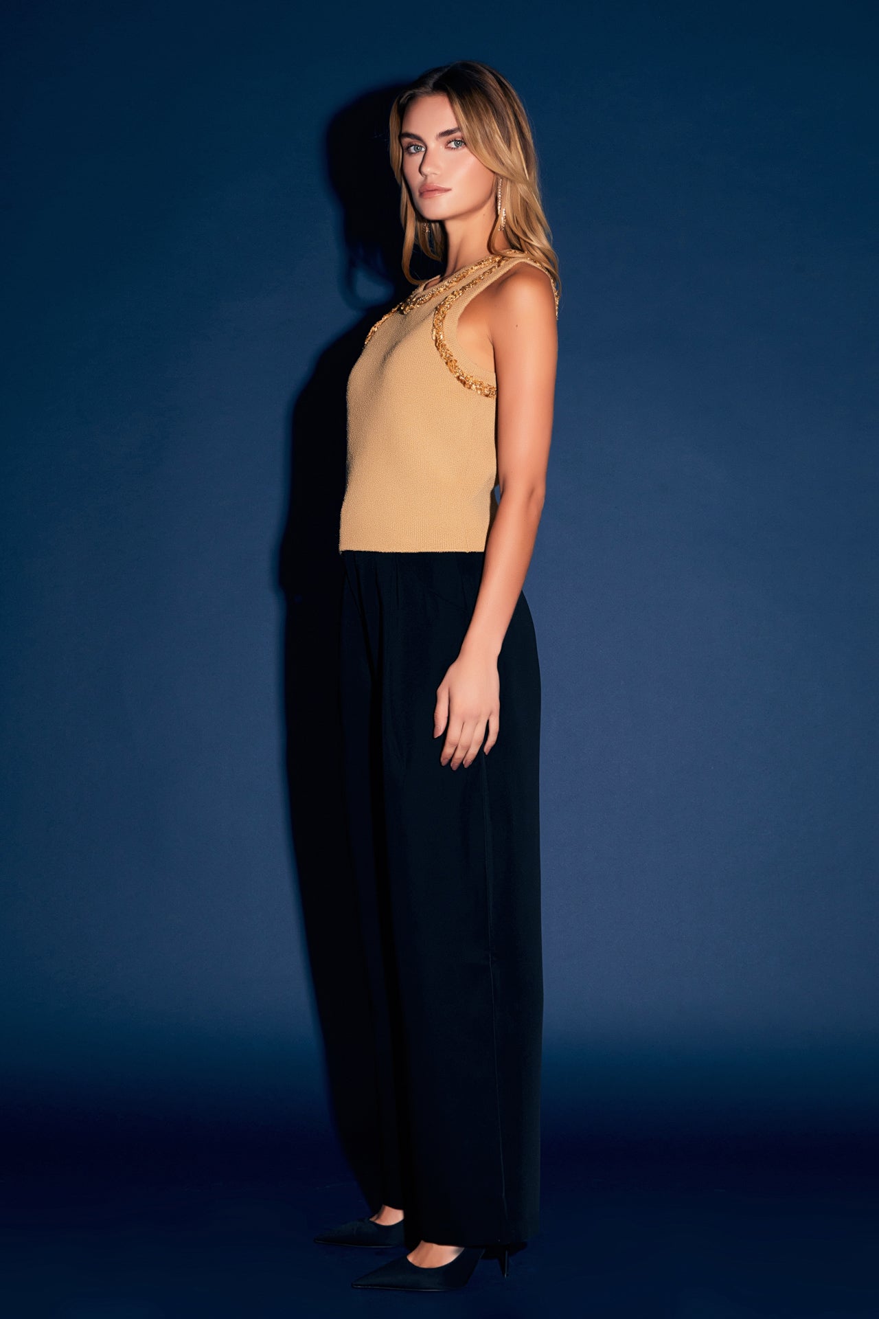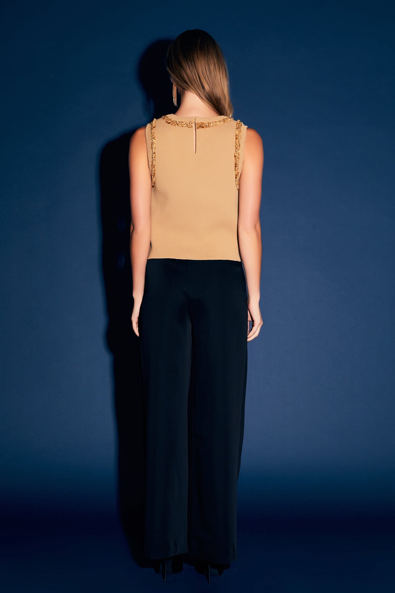 Add a touch of elegance to your wardrobe with this incredibly detailed tank top. The knitted pattern features narrow trim detailing and a round neckline that adds a subtle statement to any outfit. The eye-catching design is sure to get noticed while the loose-fitting look keeps your look modern and comfortable. Whether you’re heading out for drinks with friends or grabbing an evening stroll with someone special this trim detail knit tank top will be your go-to for effortless style.