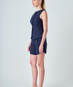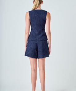 Introducing the Tweed Buttoned Sleeveless Top. The crisp buttons and clean lines bring a polished edge, while the sleeveless design keeps it light and versatile for layering or standalone wear. Perfect under a structured blazer for the office or paired with jeans for a weekend look, this top adds an unexpected touch of sophistication and personality to any outfit. It’s the kind of piece that effortlessly bridges the gap between workwear and casual chic.”