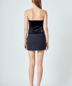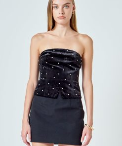 Step out in style with our exquisite Velvet Rhinestone Bustier, the perfect addition to your collection of statement tops. Its strapless design flatters your shoulders while the luxurious velvet fabric adds a touch of elegance. The dazzling rhinestones along the bustline will catch everyone’s eye, making you the star of the show. Our bustier also features a convenient back zipper for easy wear. Perfect for a night out or special occasion, this piece is a must-have in your wardrobe. Elevate your look and be the envy of fashionistas everywhere.