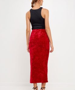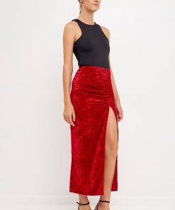 Look effortlessly chic in this stylish Velvet Ruched Maxi Skirt. Crafted from high-quality velvet material this skirt features ruched detail a front slit with sheer enchantment and a maxi length to give you an elegant silhouette. Not just perfect to wear for special occasions but also cozy enough for your everyday look. Enhance your wardrobe with this dreamy essential. Shop the Velvet Ruched Maxi Skirt now!